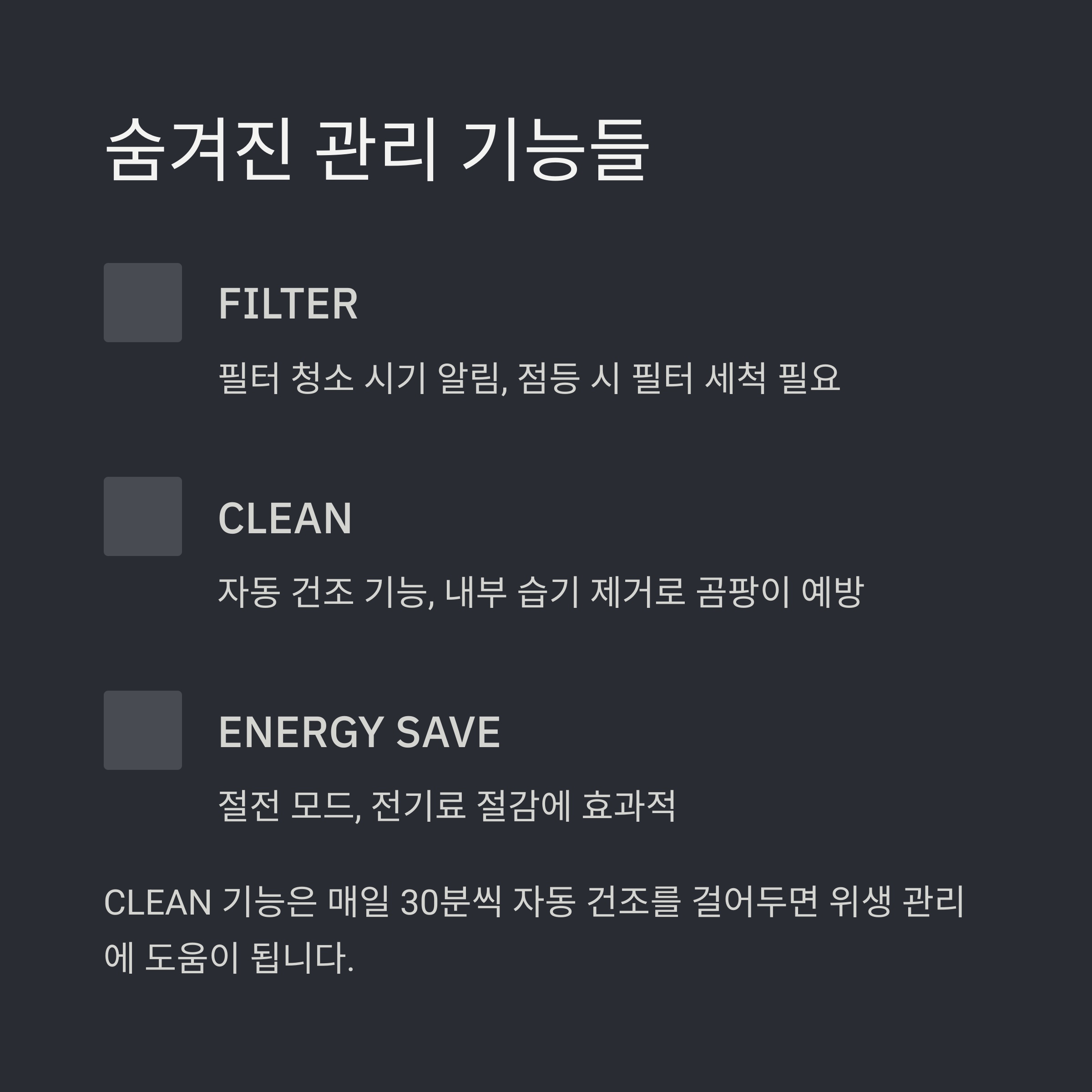 | CLEAN | 자동 건조 기능, 내부 습기 제거 |