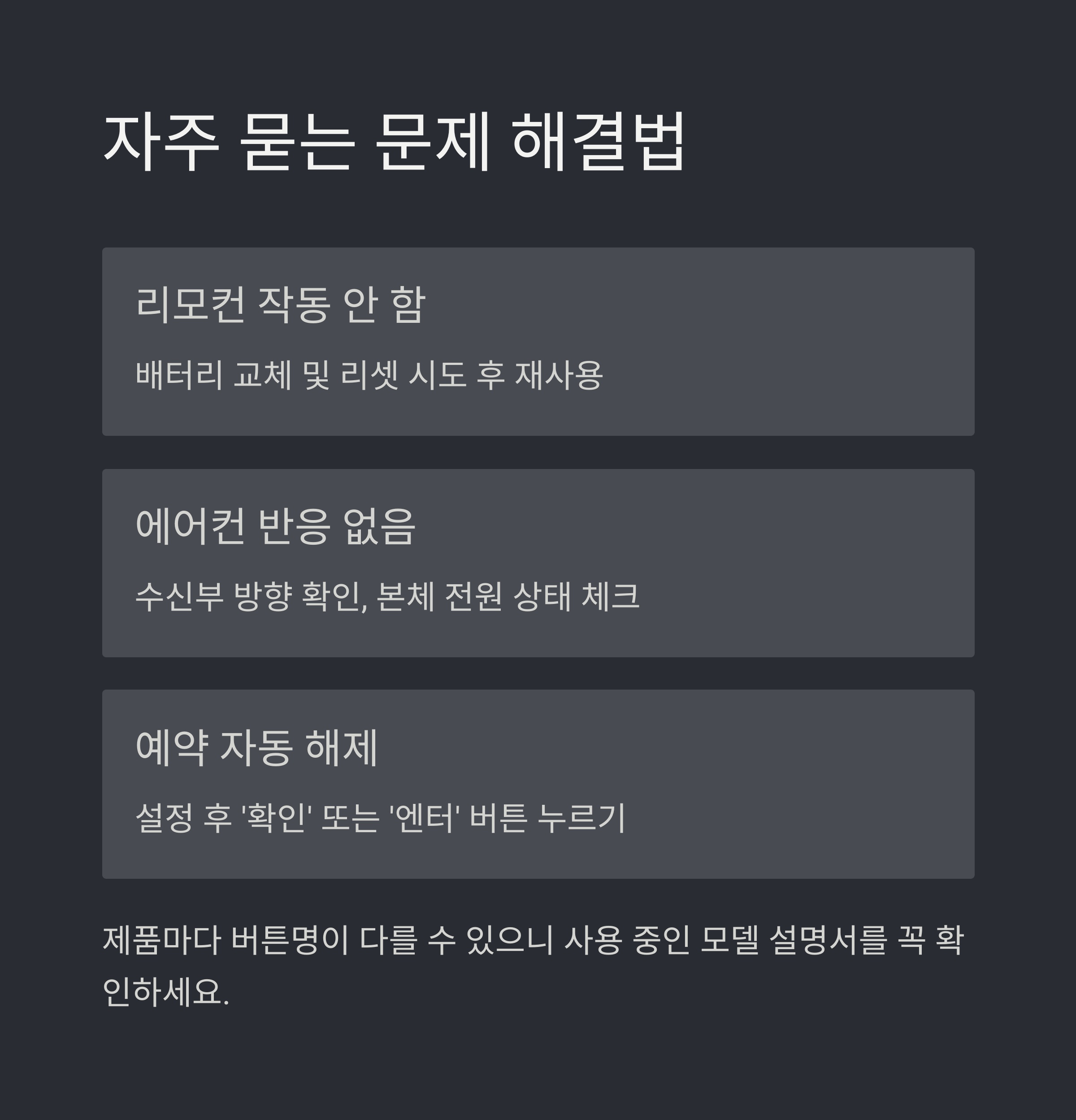 | 버튼을 눌러도 에어컨 반응이 없어요 | 수신부 방향 확인, 본체 전원 상태 체크 |
