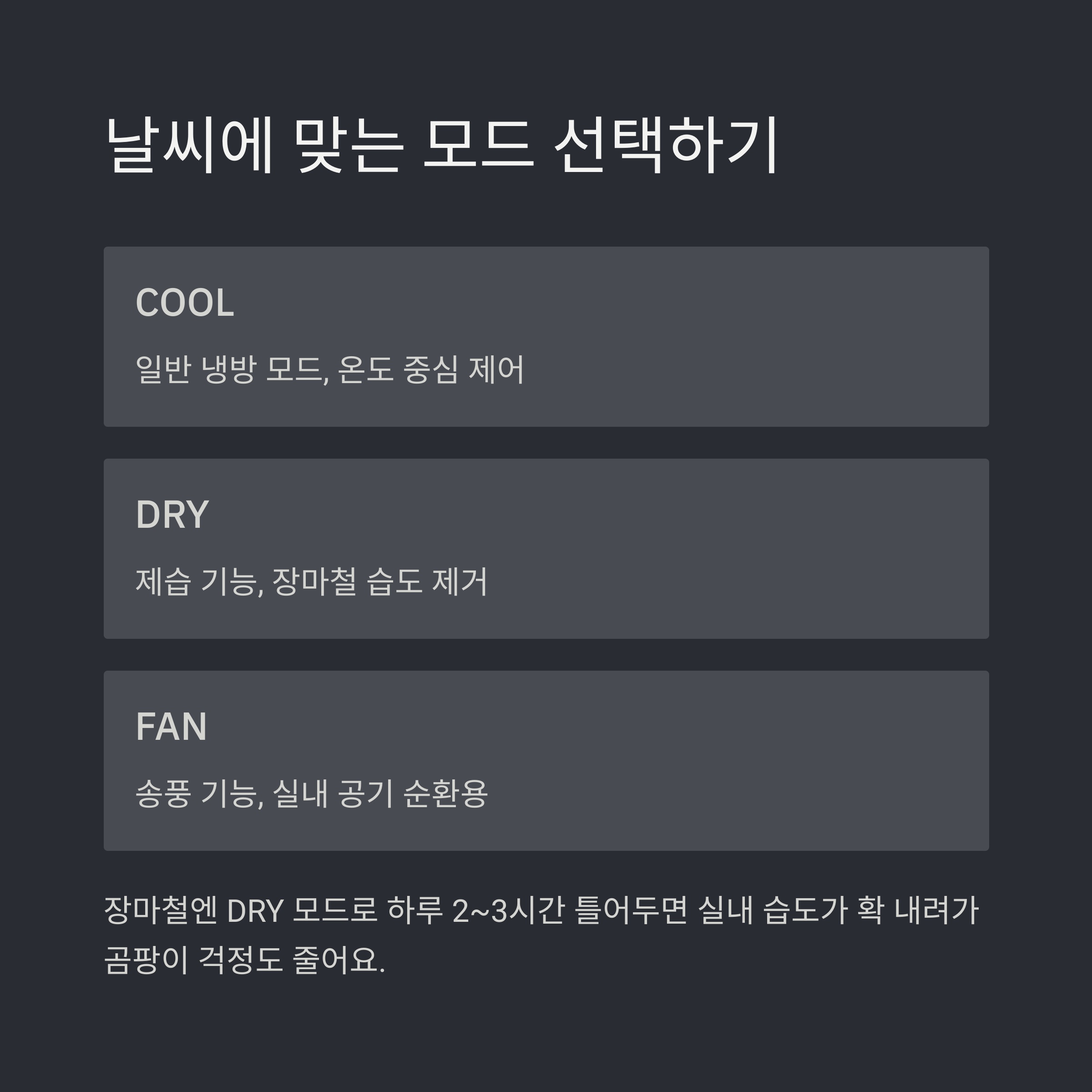 "장마철엔 DRY 모드로 하루 2~3시간 틀어두면