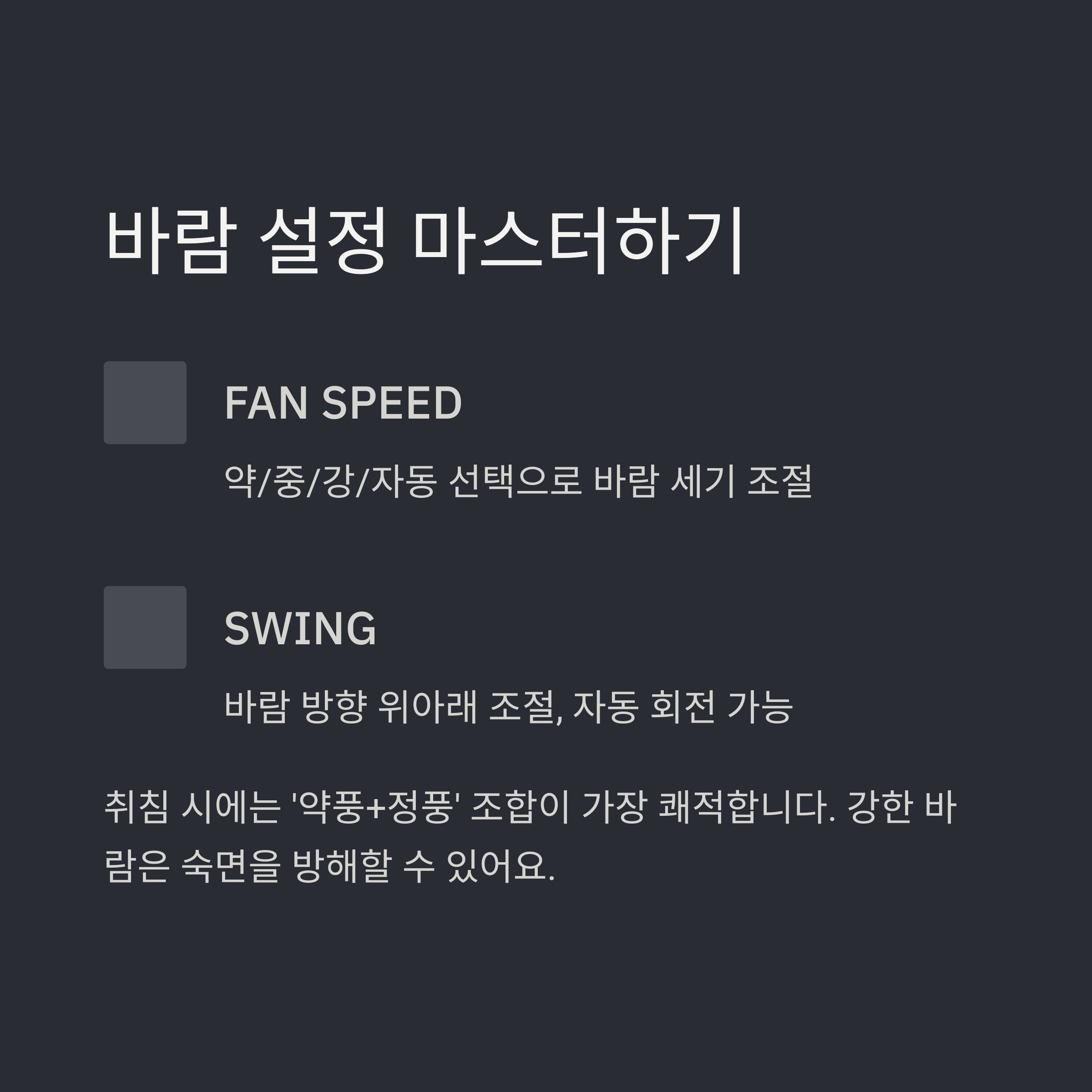 특히 취침 시에는 ‘약풍+정풍’ 조합이 가장 쾌적하답니다.