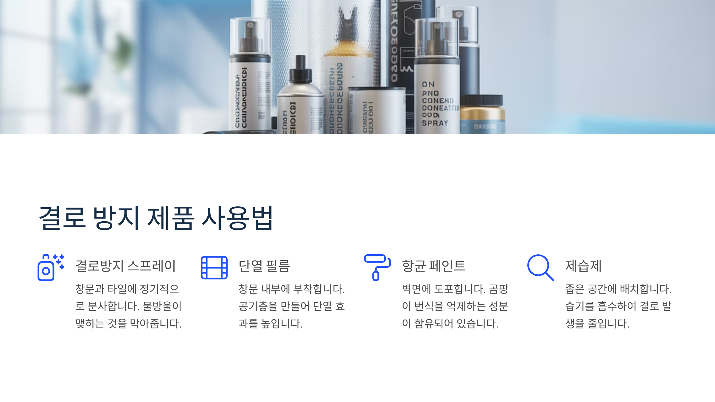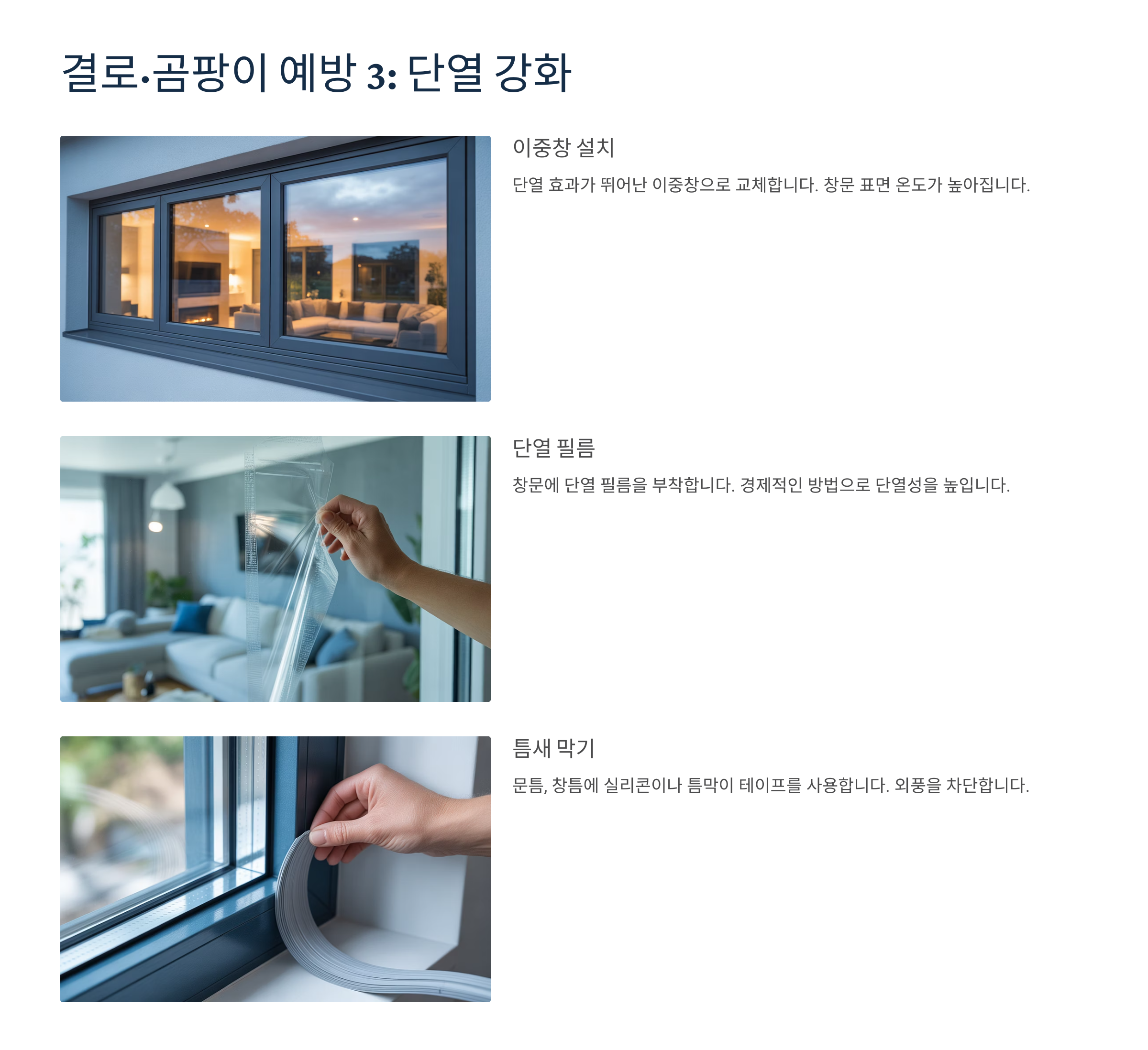 | 단열 | 벽지/창틀 단열재 시공 | 결로 방지 | 중~고 | 추천 |