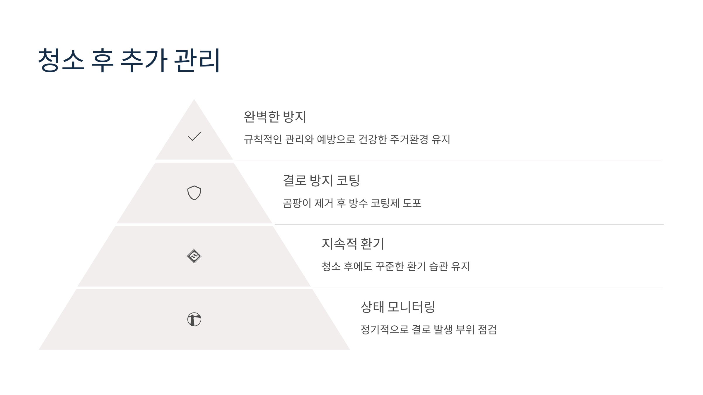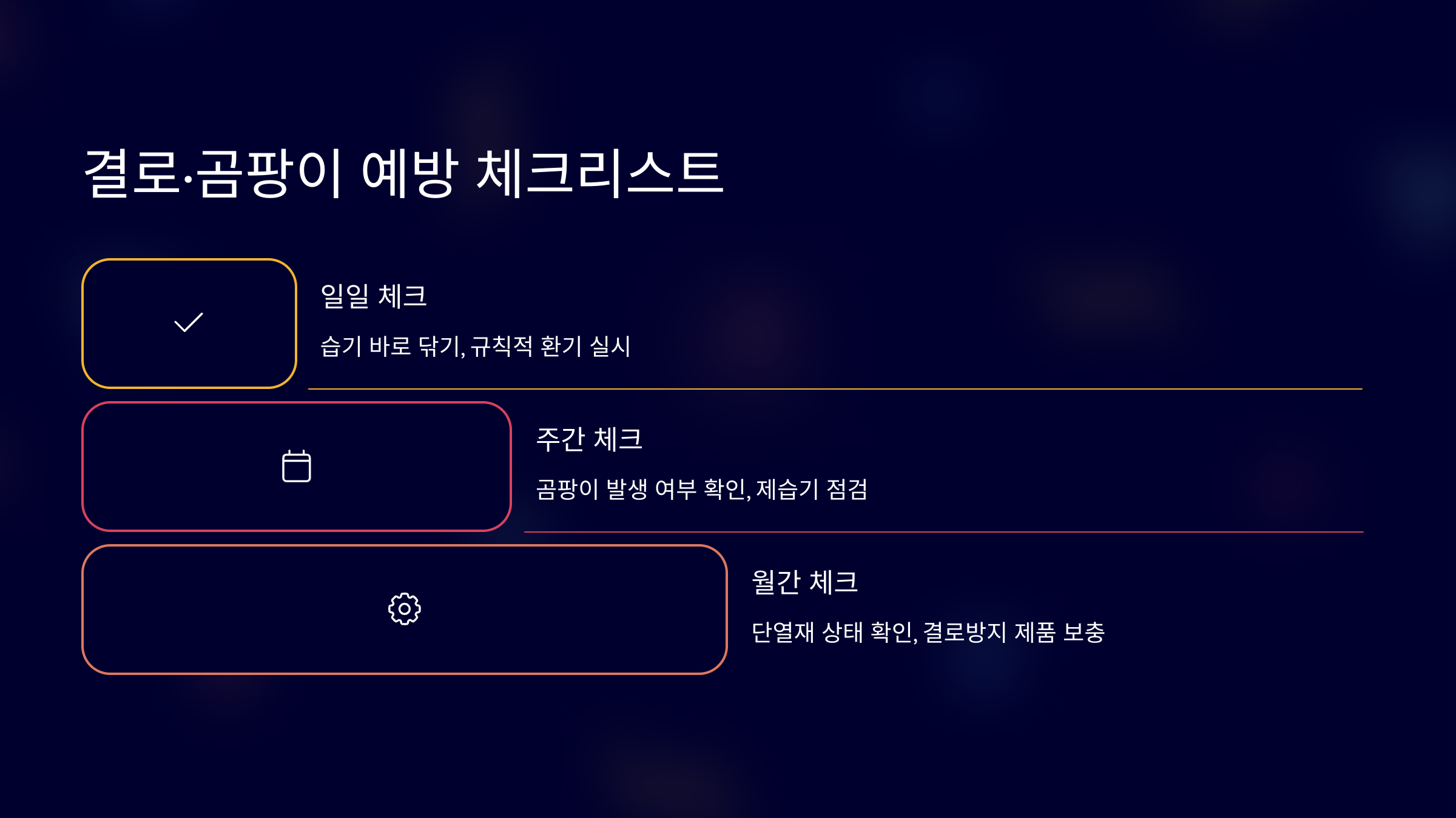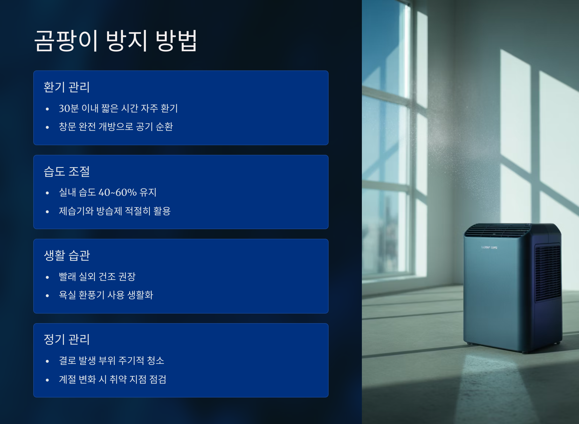 | 4단계 | 제습기 가동 | 수시 | 습도 관리 | 곰팡이 방지 |
