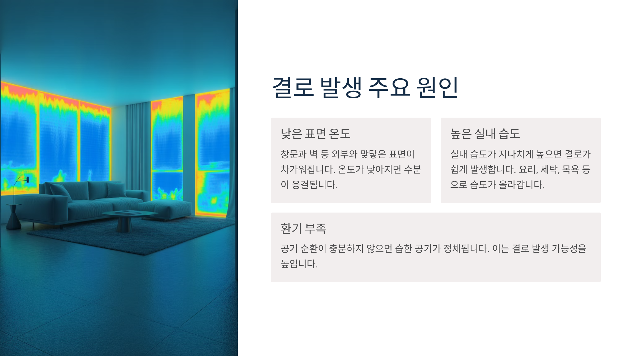 | 단열 부족 | 벽 온도 낮음 | 겨울철 | 외벽, 창틀 | 단열보강 |