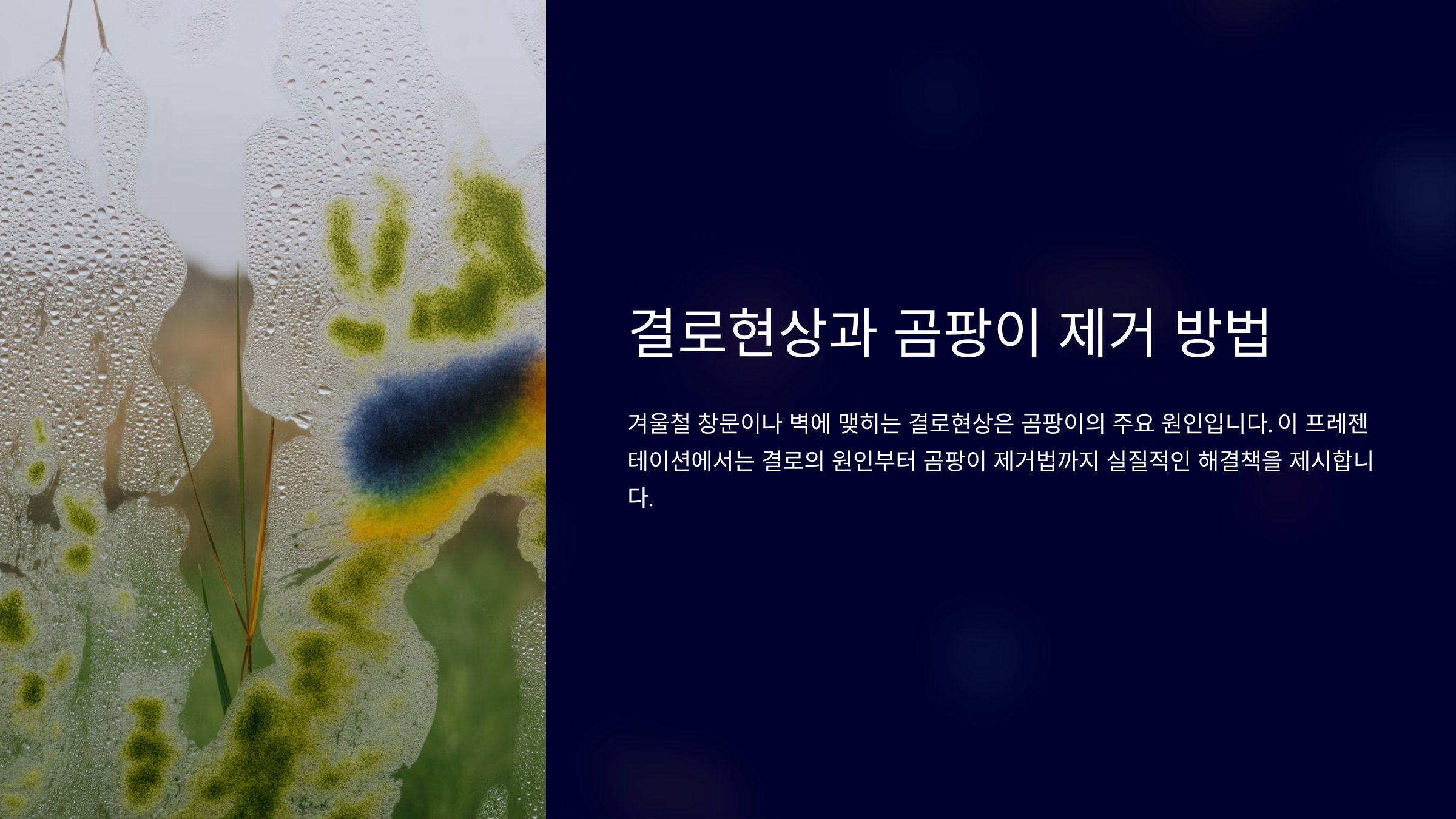 | 결로 | 표면에 물방울 맺힘 | 겨울철 | 벽지, 창틀 | 환기, 단열 |