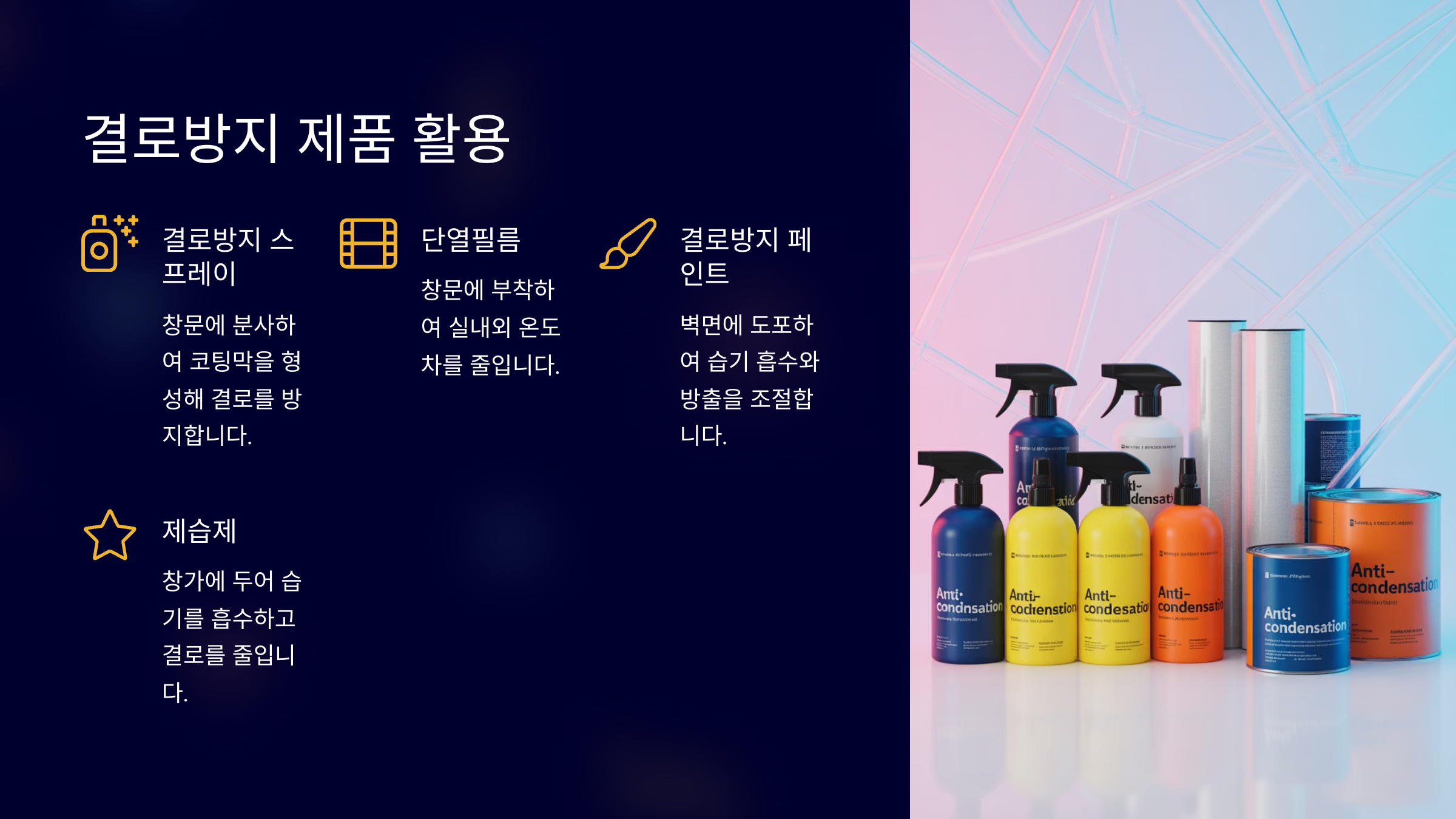 | 곰팡이 방지제 | 벽지/창틀 분사 | 포자 억제 | 저 | 추천 |
