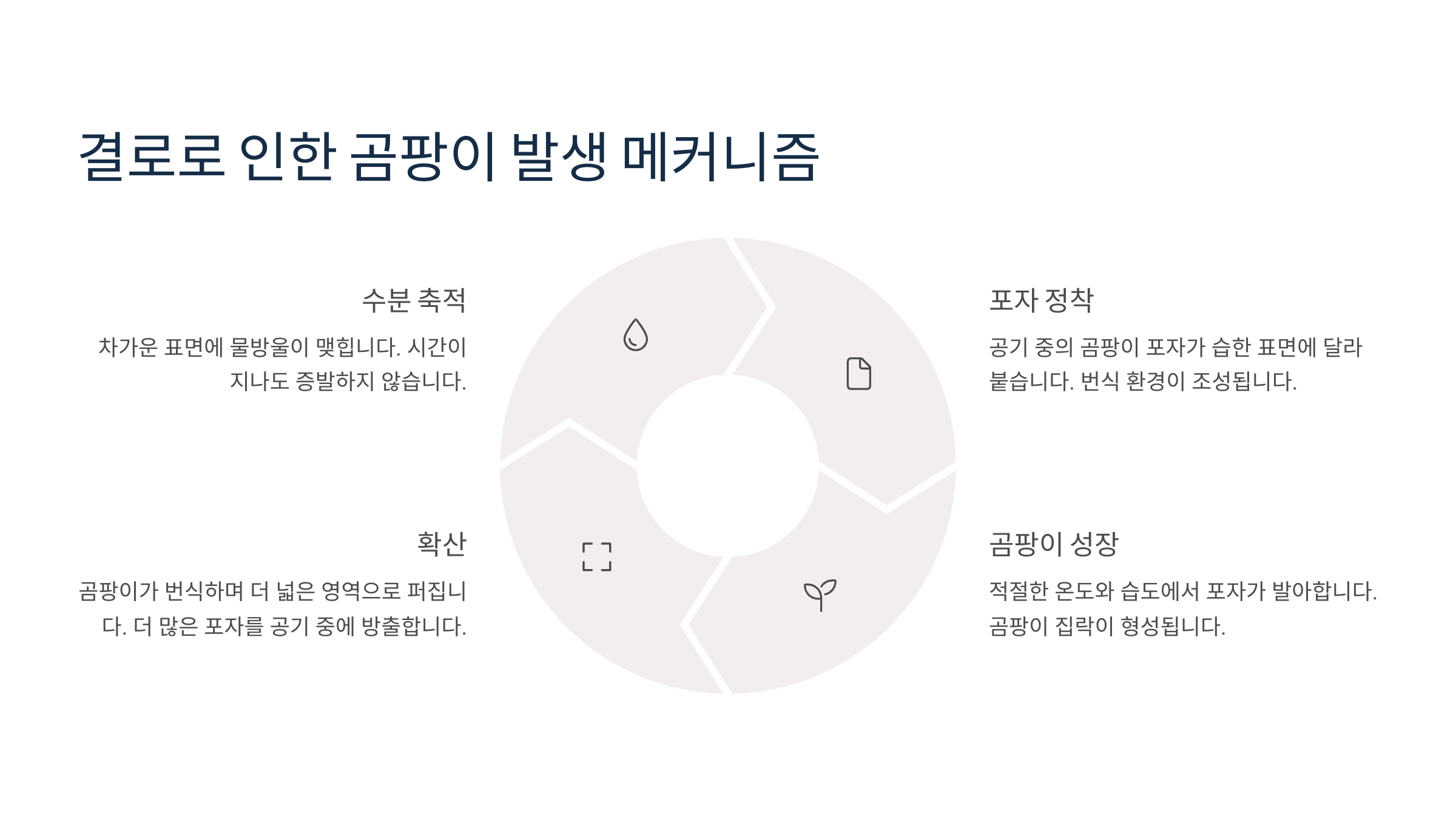 곰팡이는 공기 중에 떠다니는 포자 상태로 존재하다가, 습기가 많은 곳에 달라붙어 번식하게 돼요. 결로현상으로 벽지나 창틀에 물기가 맺히면 그곳이 곰팡이의 ‘집’이 되어버리는 셈이죠. 이런 곳은 햇볕이 잘 들지 않거나 환기가 부족한 경우가 많아 곰팡이가 더 잘 자라요.