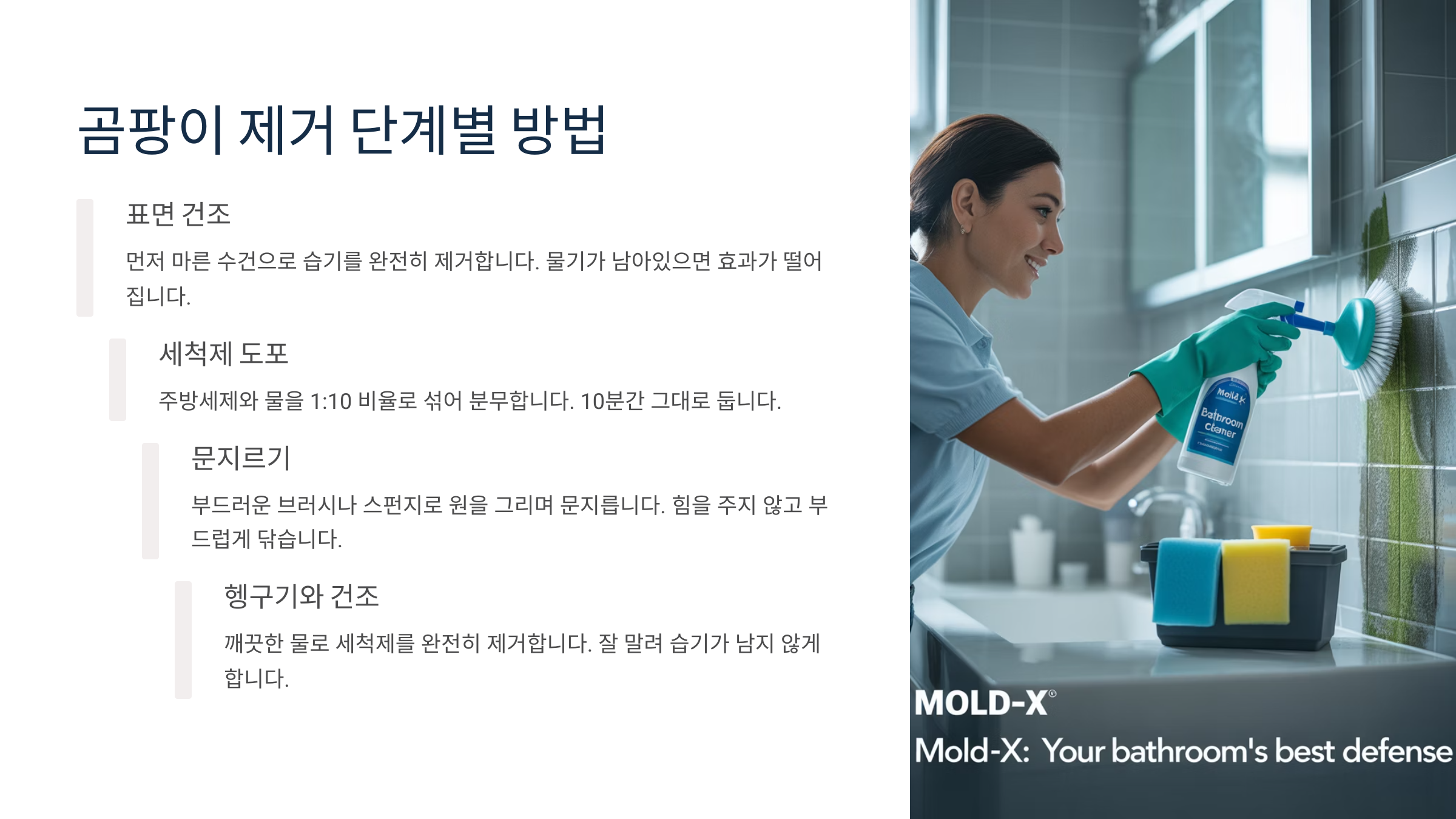 | 1단계 | 곰팡이 제거제 분사 | 10~15분 | 환기 필수 | 분무기로 고루 분사 |