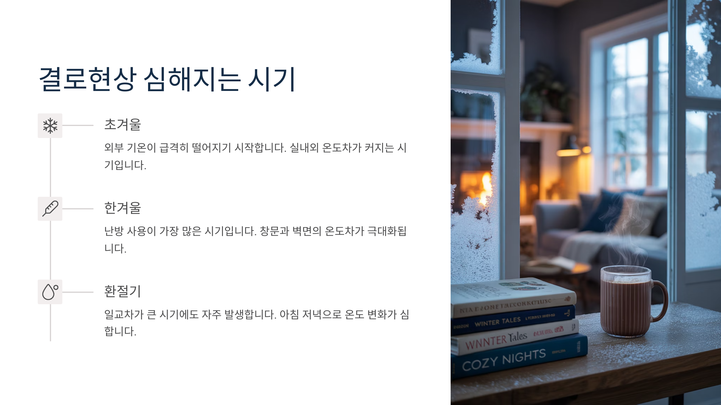 A1. 주로 겨울철 실내외 온도 차이가 크고, 습도가 높을 때 발생해요.