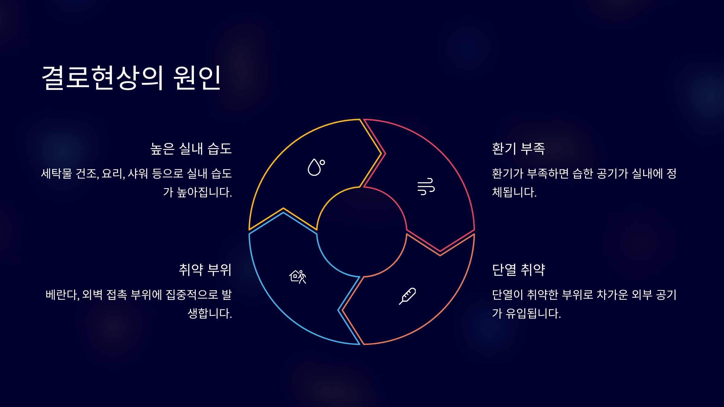 | 장소 | 창틀, 벽지, 옷장 | 단열 부족 | 아침, 저녁 | 건강 문제 |