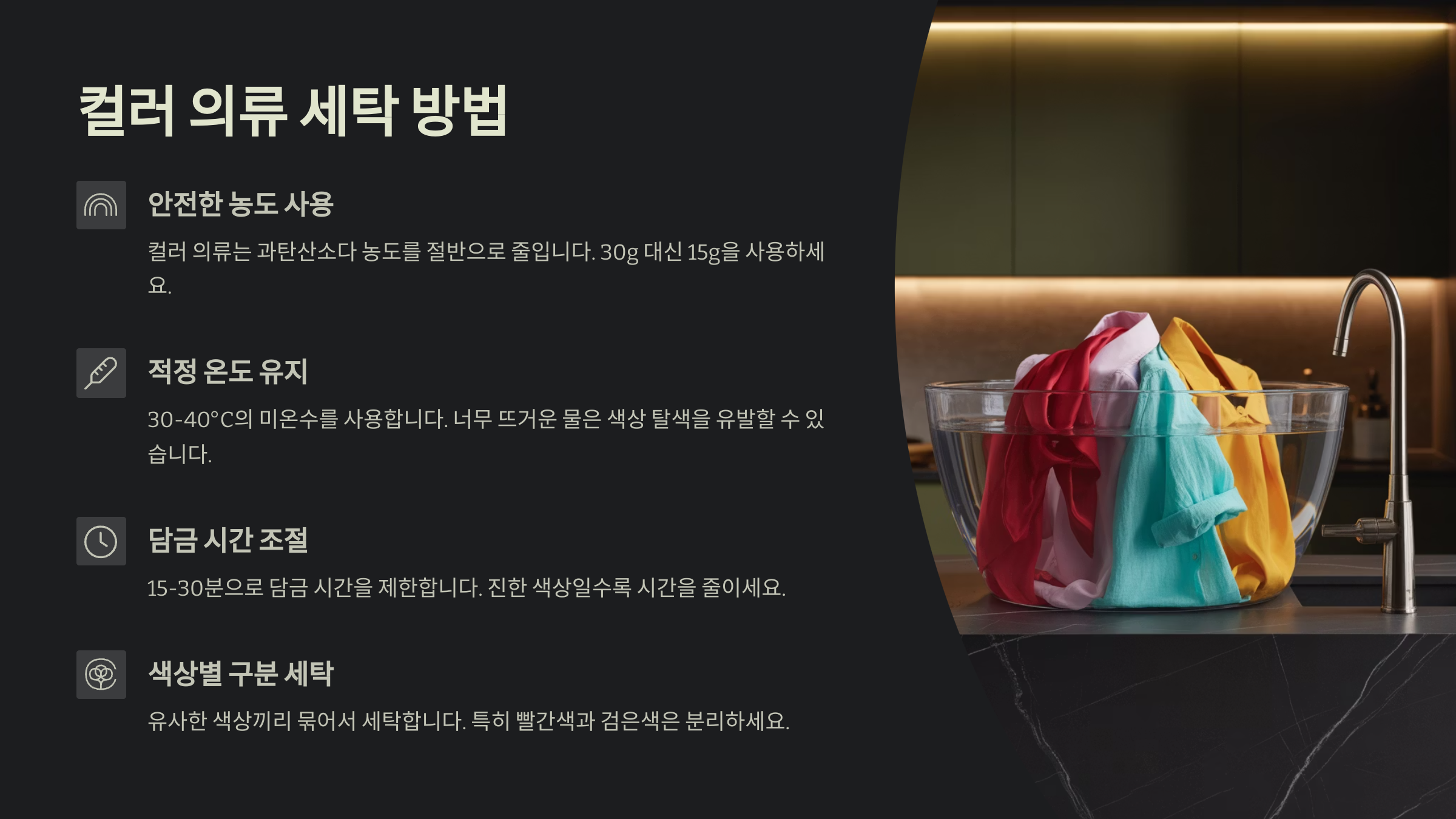 | 색상 옷 | 탈색 위험, 사전 테스트 필수 |