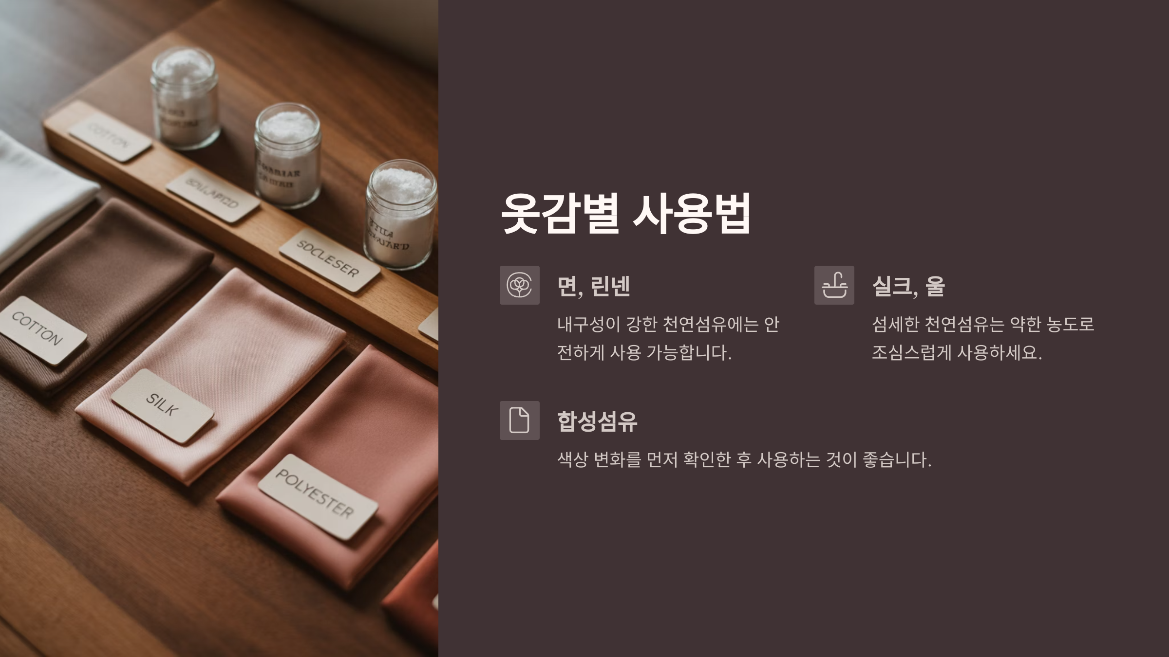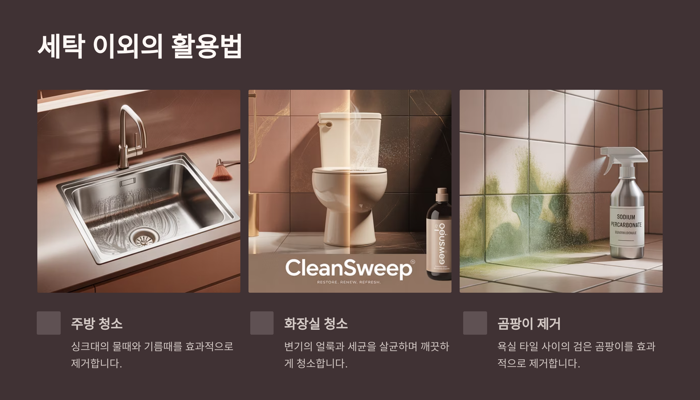 | 사용 예 | 수건, 흰옷, 세탁조 청소 | 냉장고, 싱크대, 프라이팬 |