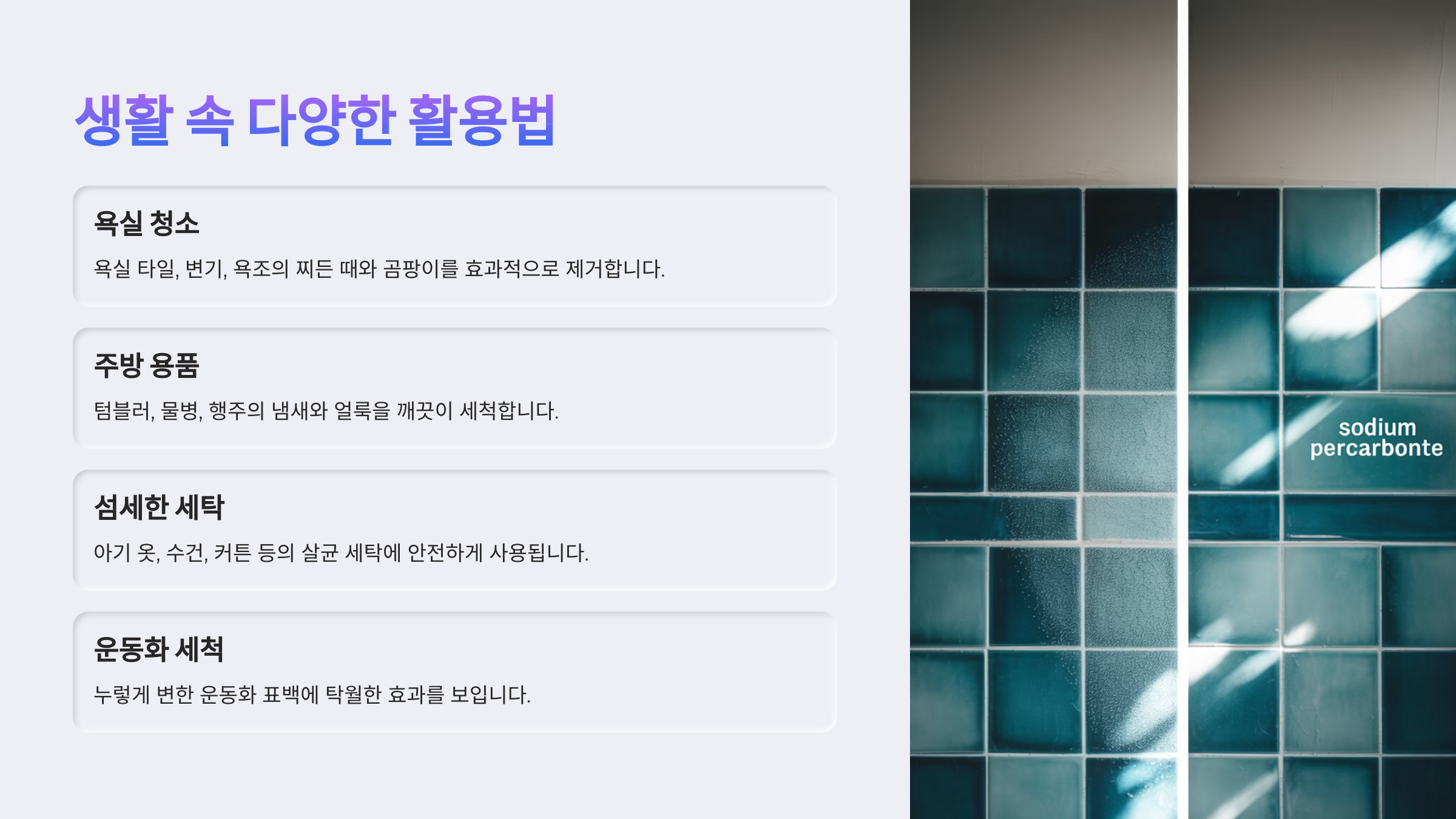 결국 과탄산소다는 단순한 세정제를 넘어서, 친환경 라이프를 실천하는 데 도움이 되는 착한 성분이라는 점! 다음 섹션에서는 과탄산소다가 어떻게 때를 분해하고 살균하는지 원리를 파헤쳐볼게요 🔬