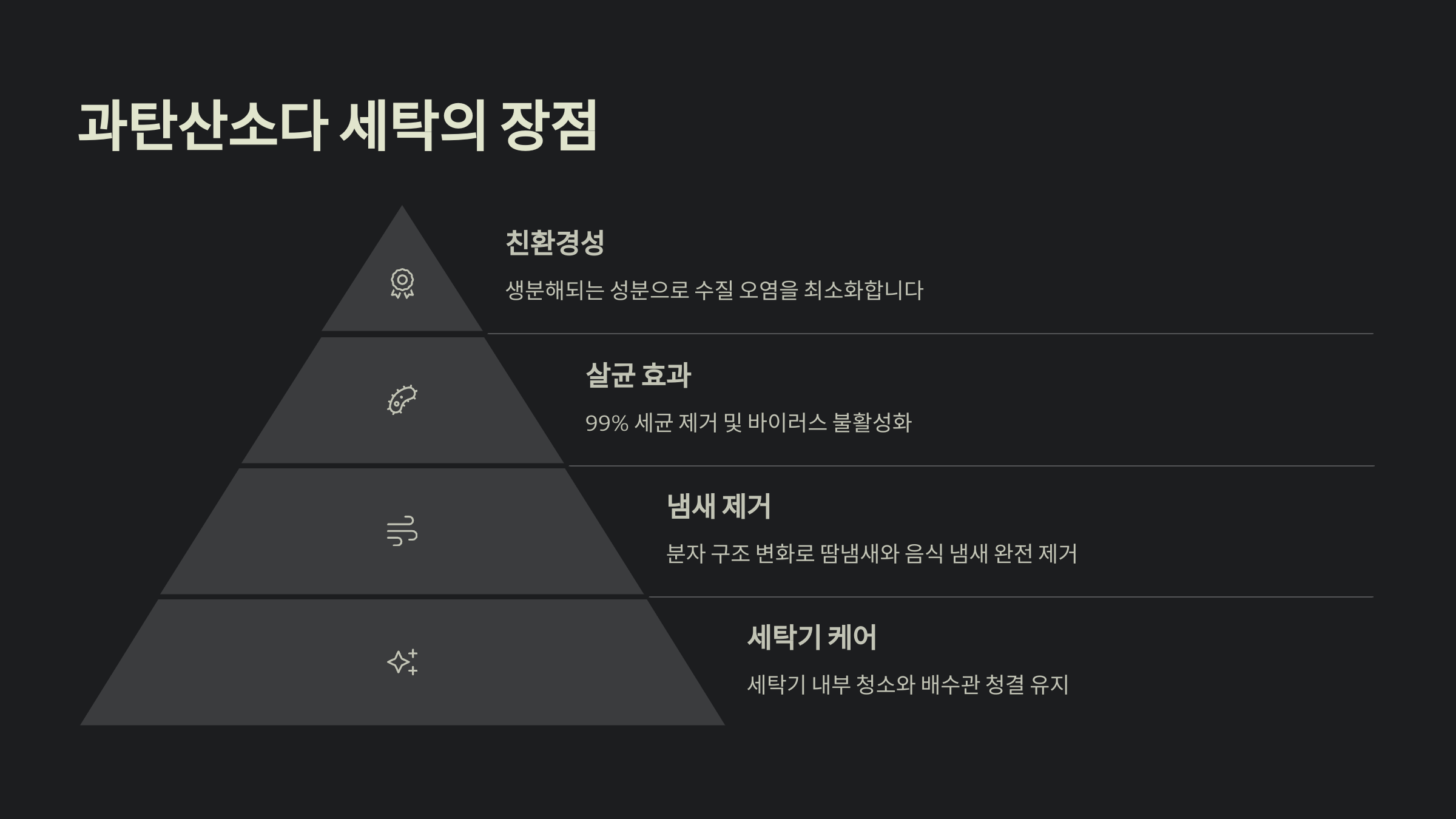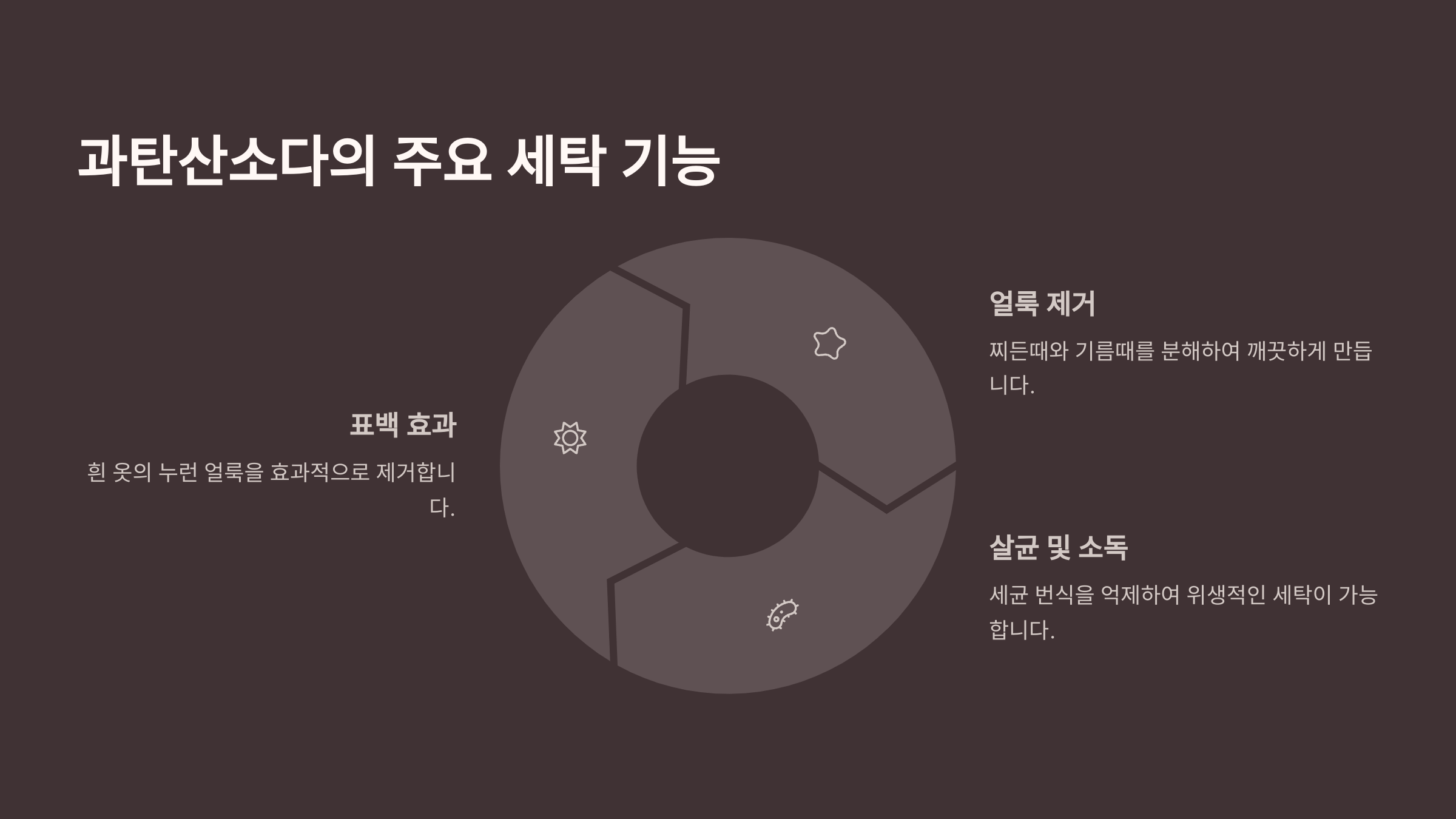 이 활성 산소는 세균이나 곰팡이와 접촉할 때 세포막을 산화시켜 파괴해요. 그래서 살균력도 매우 뛰어나고, 퀴퀴한 냄새 제거에도 효과적이에요. 특히 화장실 곰팡이 제거나, 수건 냄새 없애는 데 탁월하죠.