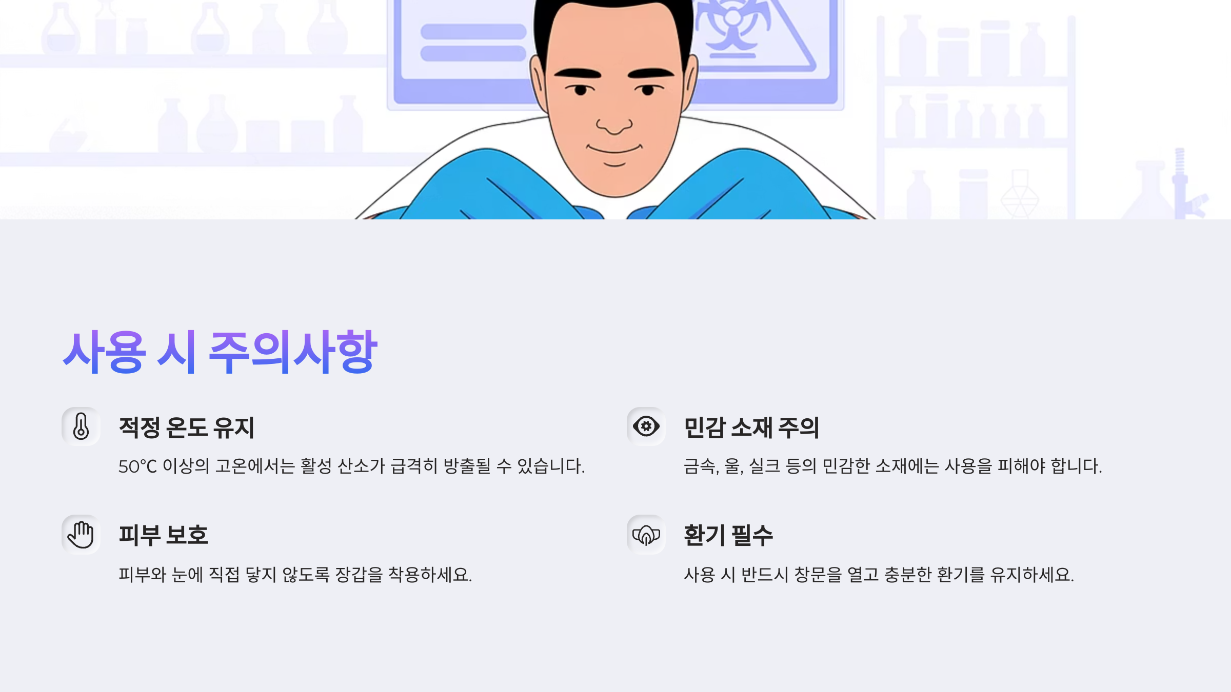| 산성과 혼용 | 구연산, 식초 등과 혼합 금지 |