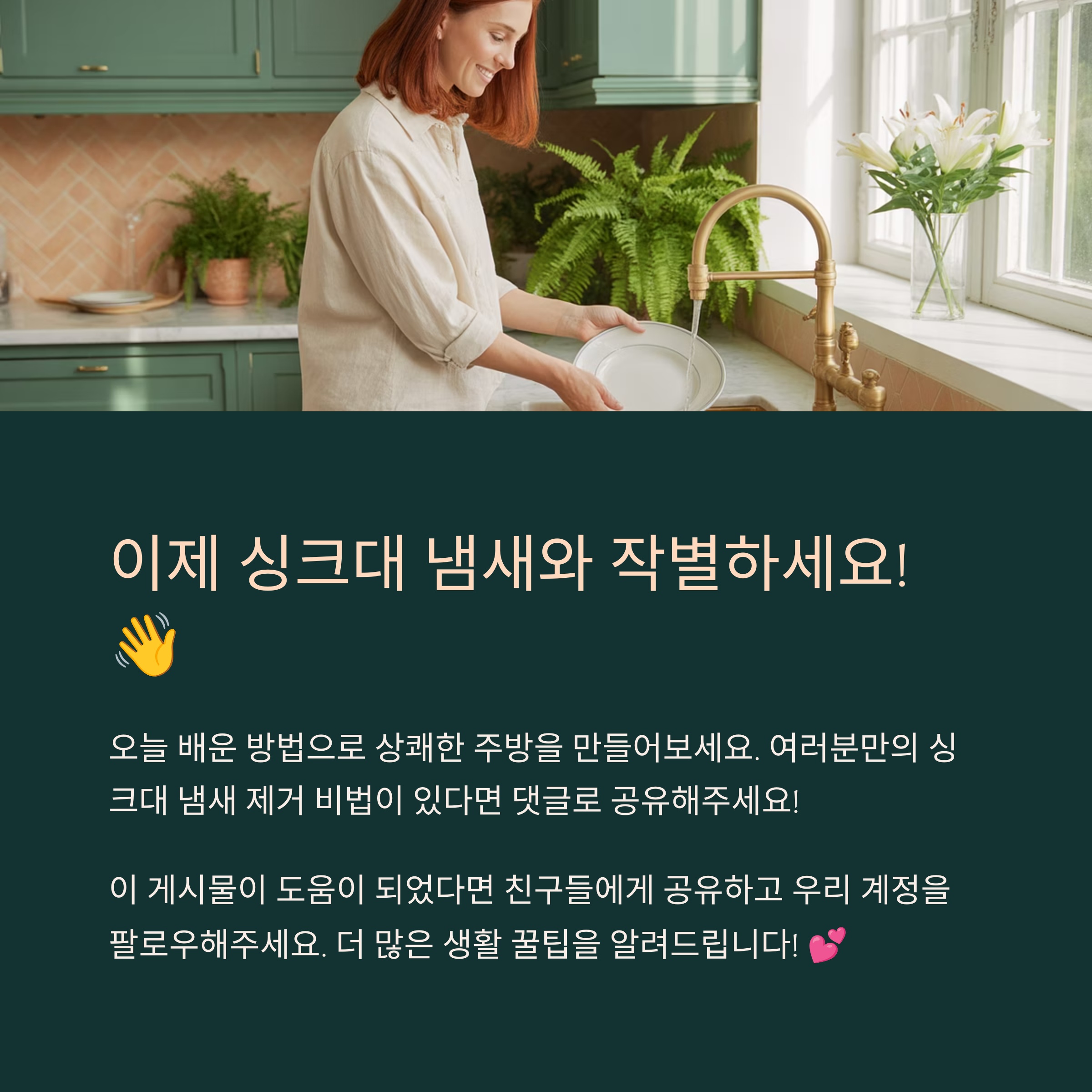 자, 이제 싱크대 냄새 때문에 더 이상 인상 찌푸릴 일은 없겠죠? 🥳 오늘 알려드린 방법들을 꾸준히 실천하시면 분명 쾌적하고 향긋한 주방을 만드실 수 있을 거예요! 여러분의 깨끗한 주방 생활을 응원합니다! 💖