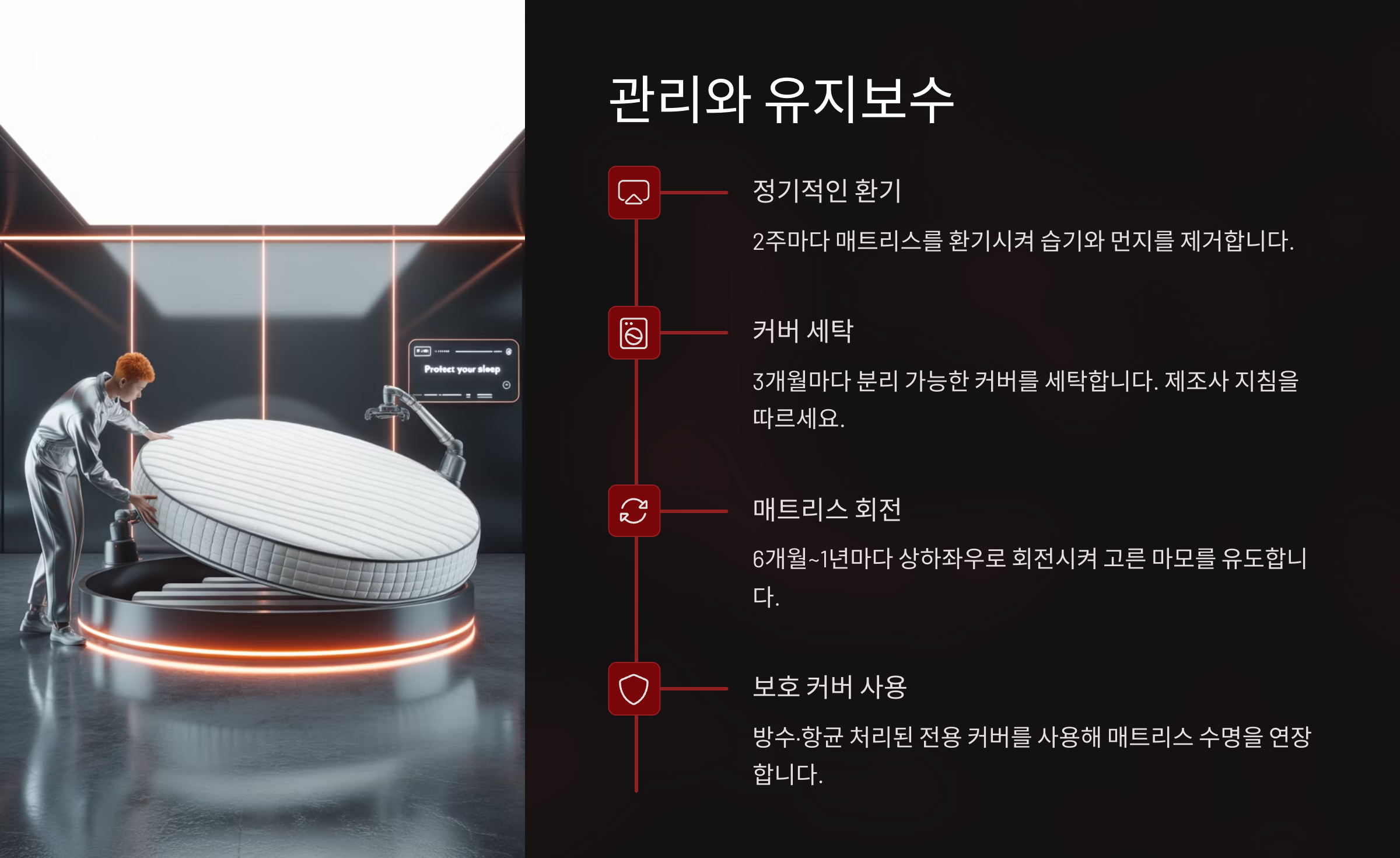 아무리 좋은 매트리스라도 시간이 지나면 지지력과 위생 상태가 떨어지기 마련이에요. 수면의 질을 유지하려면 주기적으로 점검하고, 적절한 시기에 교체하는 것이 필요해요. 아래에서 교체 시기와 관리 팁을 정리해드릴게요!