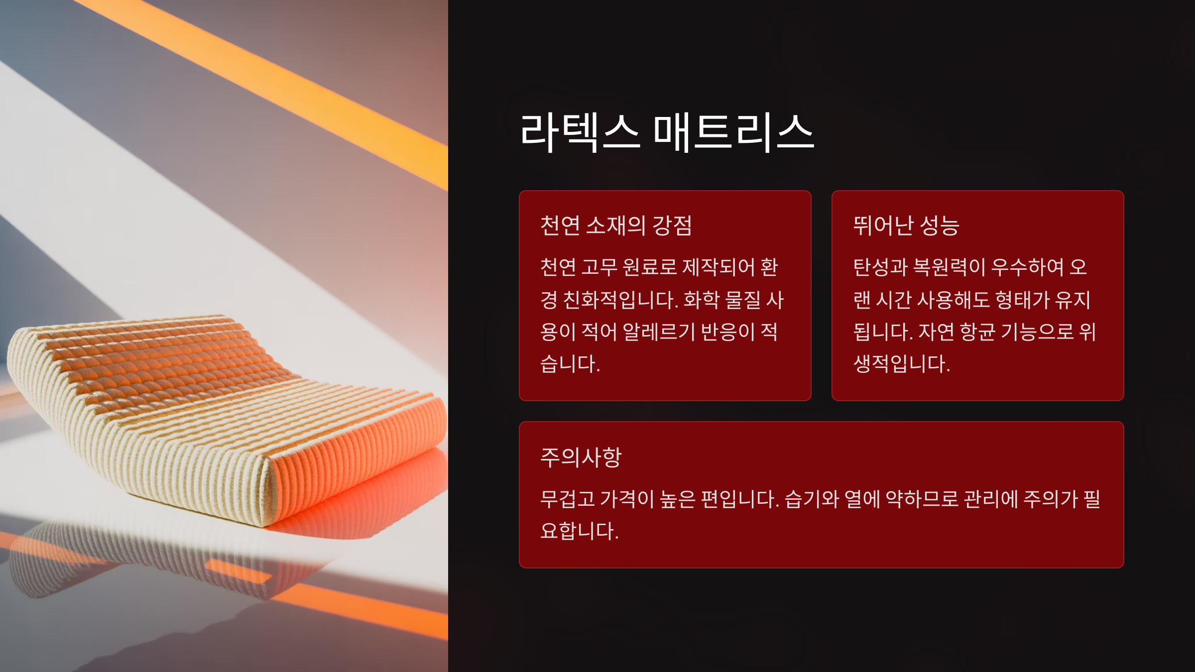 라텍스 자연 소재, 복원력 우수 가격 높음, 무게 무거움 알러지 반응 주의