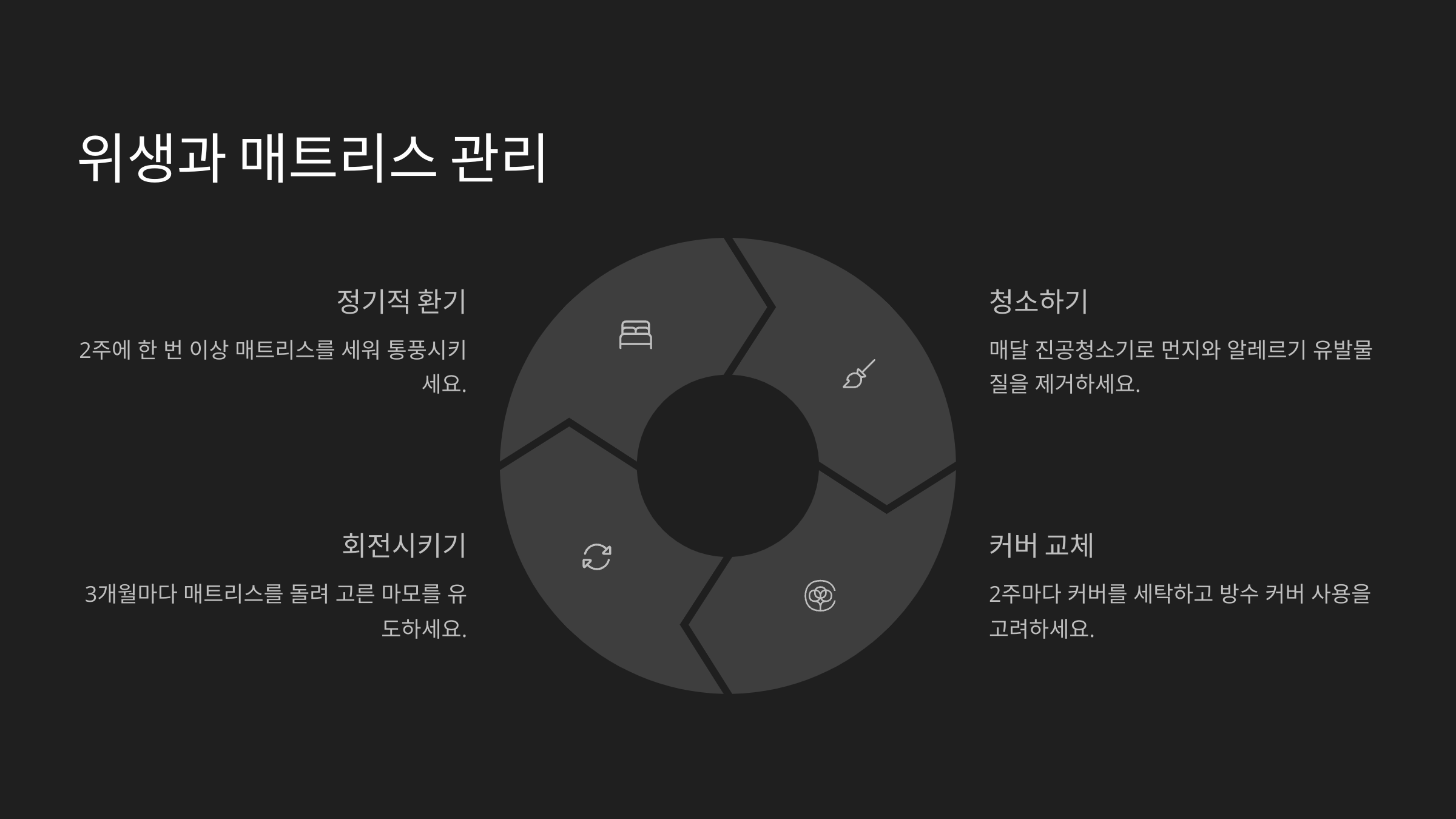 3. 통풍과 습기 관리 습기가 많으면 곰팡이와 진드기의 온상이 될 수 있어요. **주 1회 이상 창문을 열고 통풍**시키고, 매트리스 하단에 통풍구 있는 프레임을 쓰는 것이 좋아요. 특히 라텍스 매트리스는 반드시 건조 환경에서 사용해야 해요.