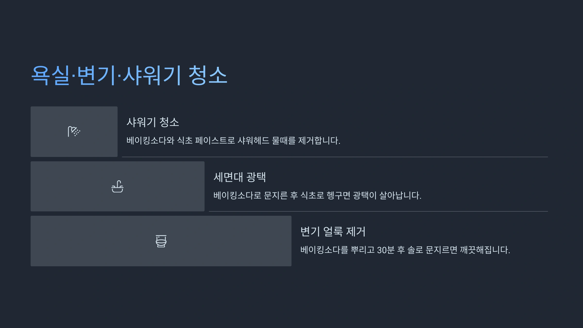- 변기, 세면대, 타일 틈새 등에 베이킹소다 가루를 뿌리고 솔로 문지른 후 물로 헹궈내면 깨끗해집니다. 식초를 함께 사용하면 시너지가 더 좋아요.
