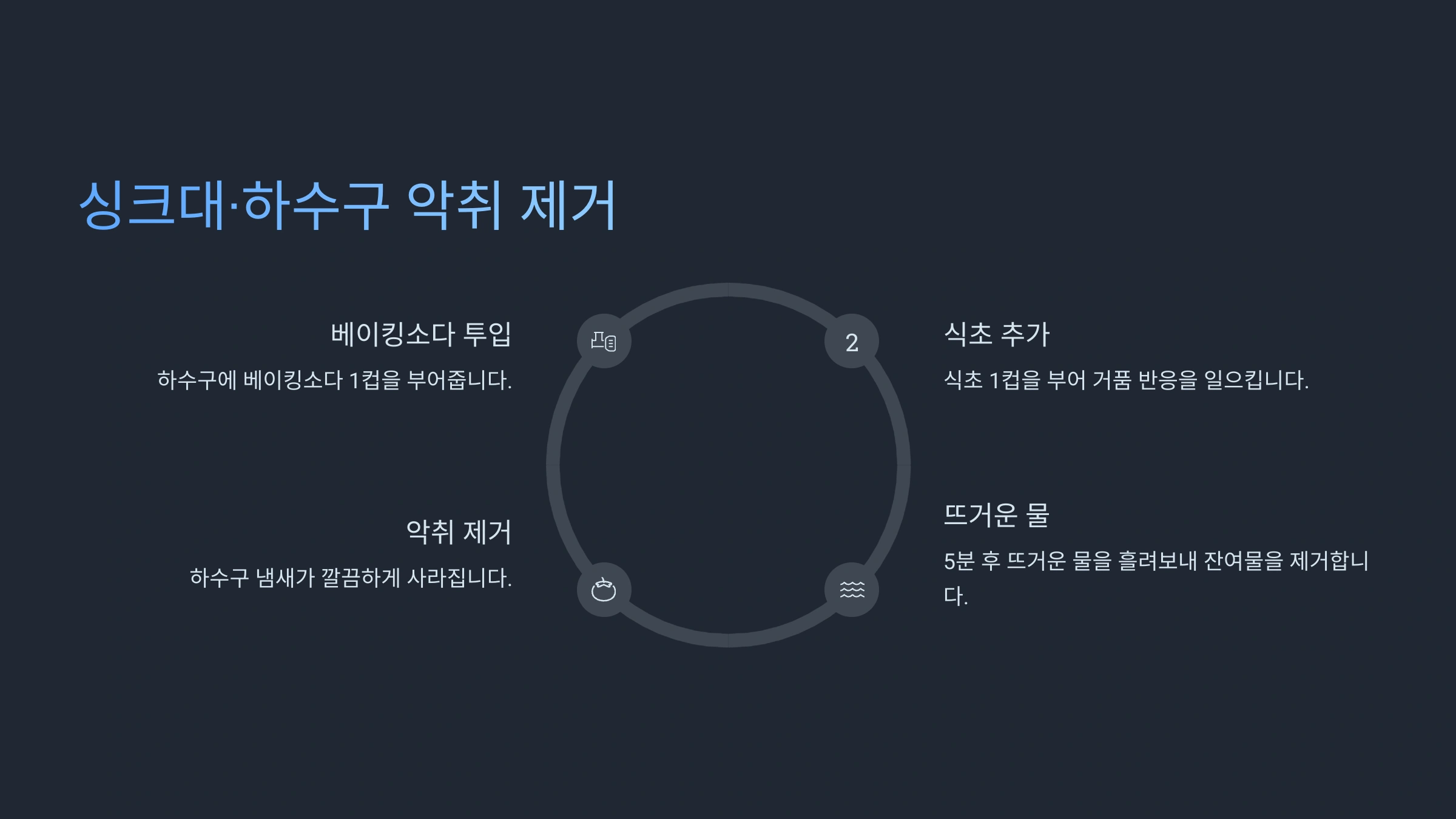 - 싱크대 배수구 & 음식물 처리: 베이킹소다를 배수구에 뿌리고 식초를 부으면 거품이 보글보글 올라오는데, 10분 후 뜨거운 물을 부으면 막혔던 배수구도 뚫리고 악취도 사라져요! 음식물 쓰레기에 뿌려두면 냄새 제거에도 효과적입니다.