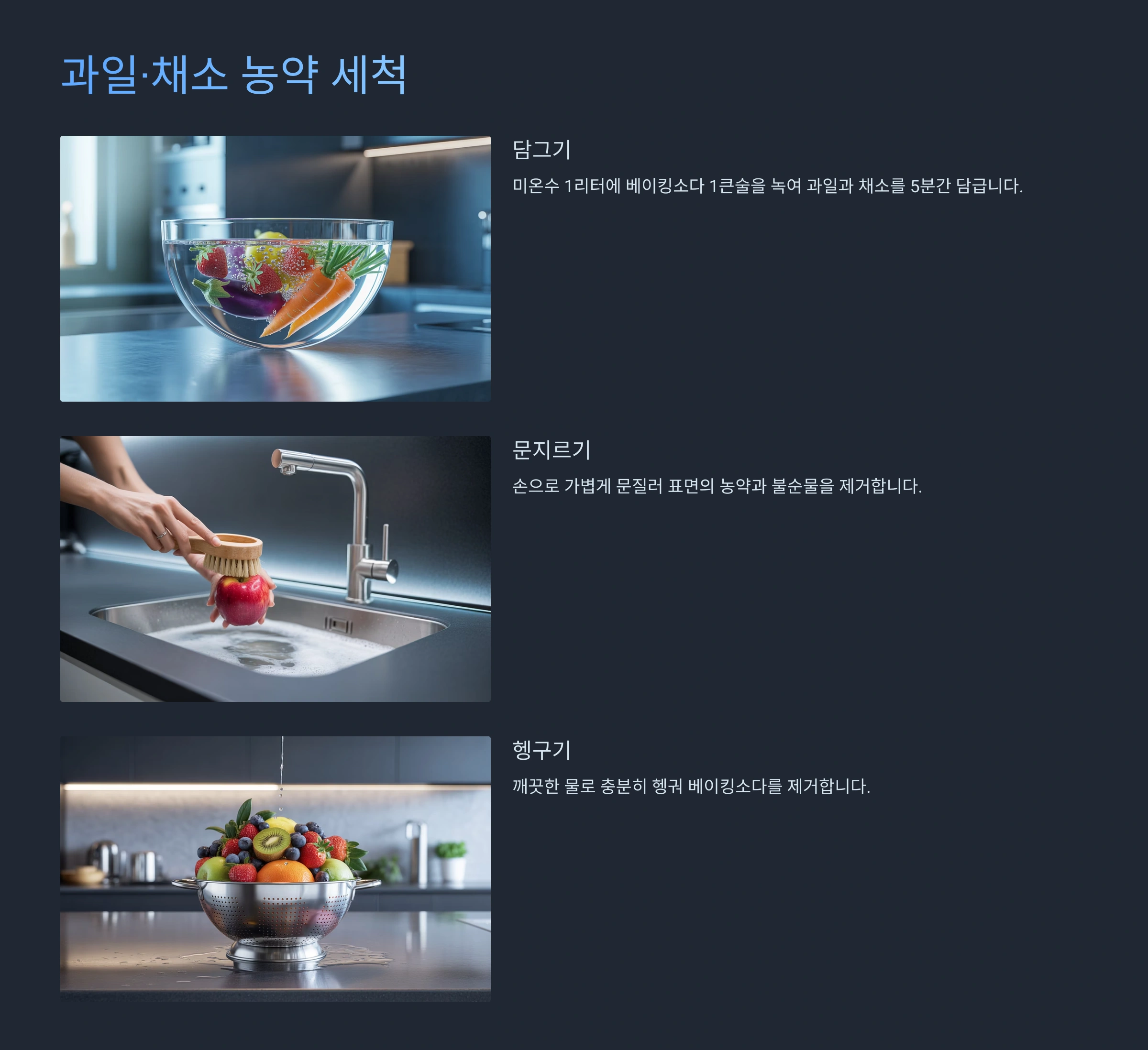 - 큰 볼에 물을 담고 베이킹소다 1~2스푼을 풀어준 다음, 과일이나 채소를 5분 정도 담갔다가 흐르는 물에 깨끗하게 헹궈주세요. 농약 잔여물이나 이물질 제거에 효과적입니다.