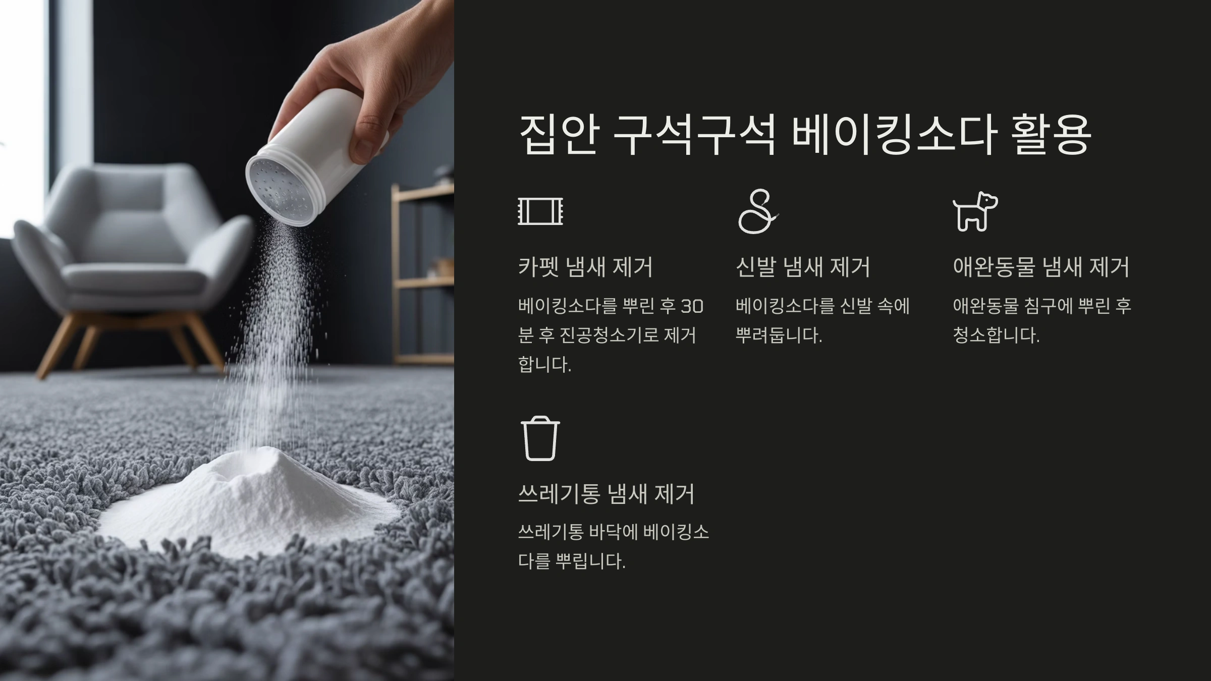 - 냉장고 탈취: 작은 용기에 베이킹소다를 담아 냉장고 안에 넣어두세요. 냄새를 싹 흡수해서 냉장고 안이 훨씬 상쾌해질 거예요. 한 달에 한 번 정도 교체해주면 좋습니다.