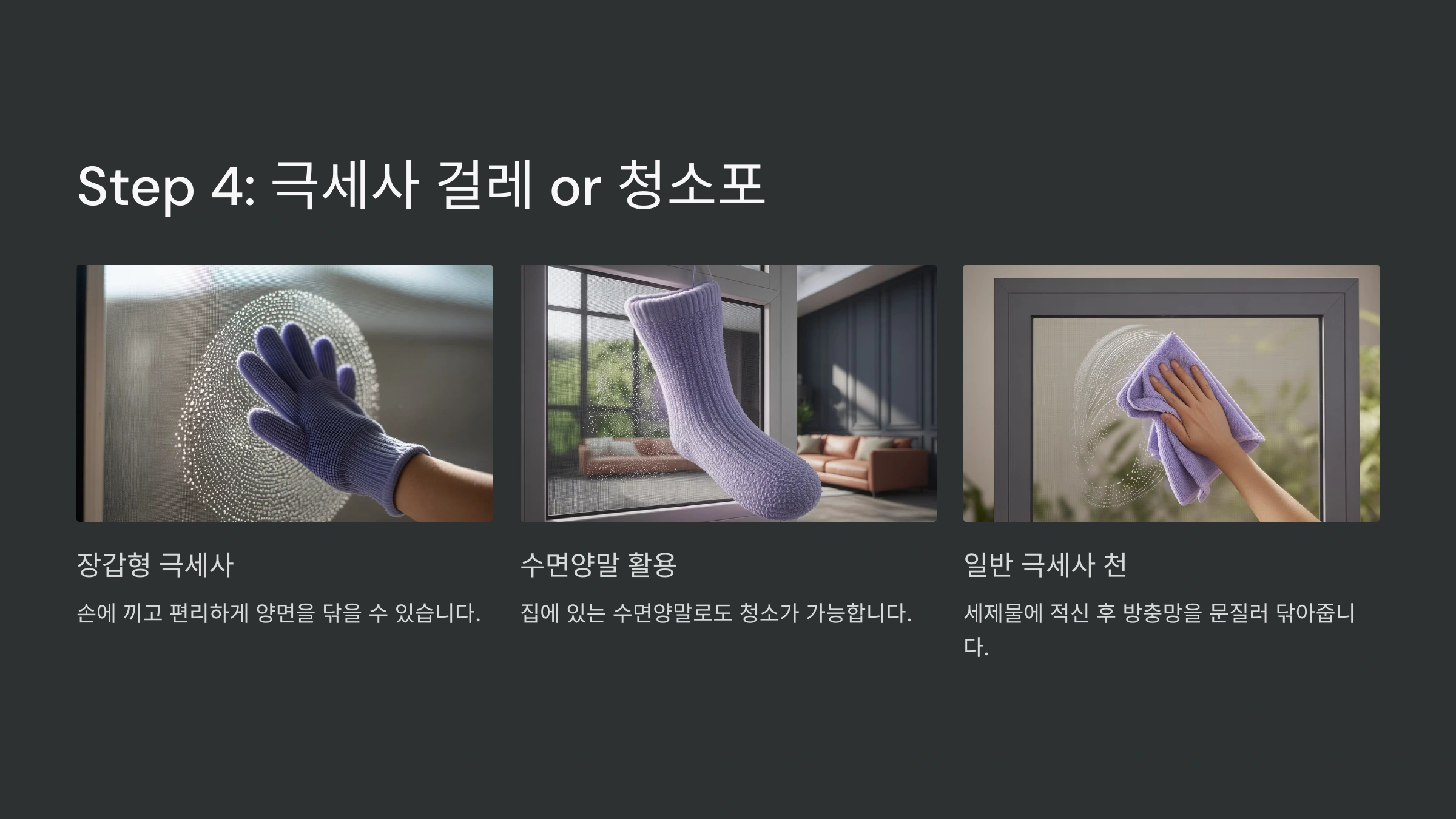 ✔ 걸레 or 마른 수건: 습식 청소 시 활용해요. 물을 묻힌 후 방충망 양면을 닦아내는 방식인데, 두 장을 앞뒤로 대고 동시에 닦으면 시간도 단축돼요. 세제가 있으면 더 효과적이죠.