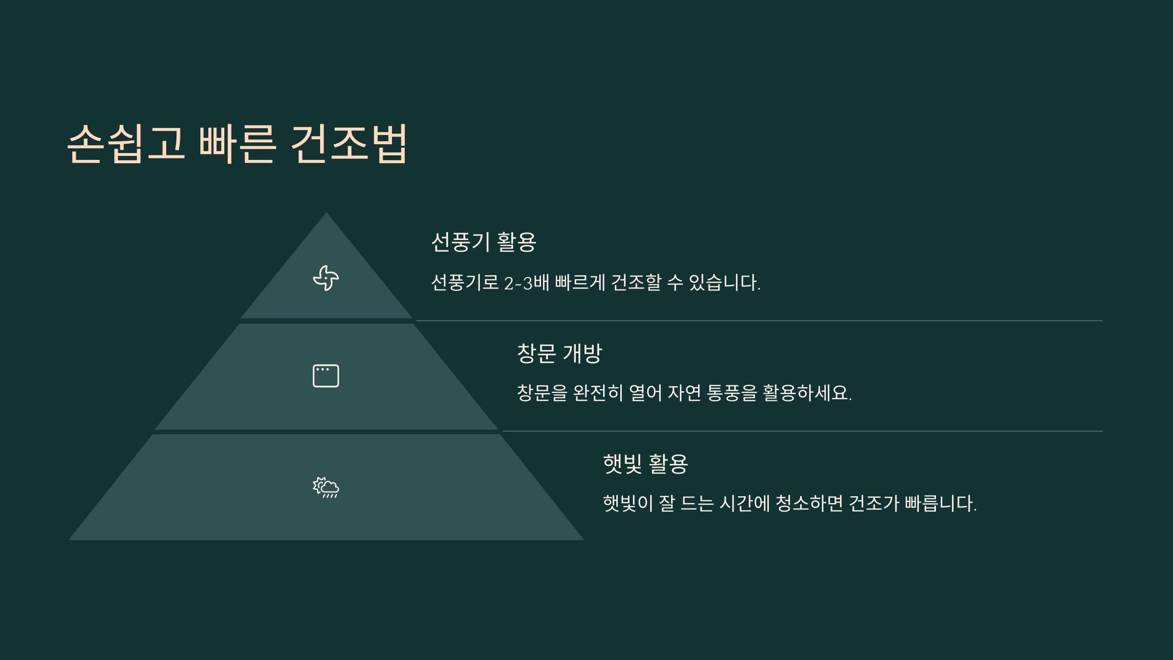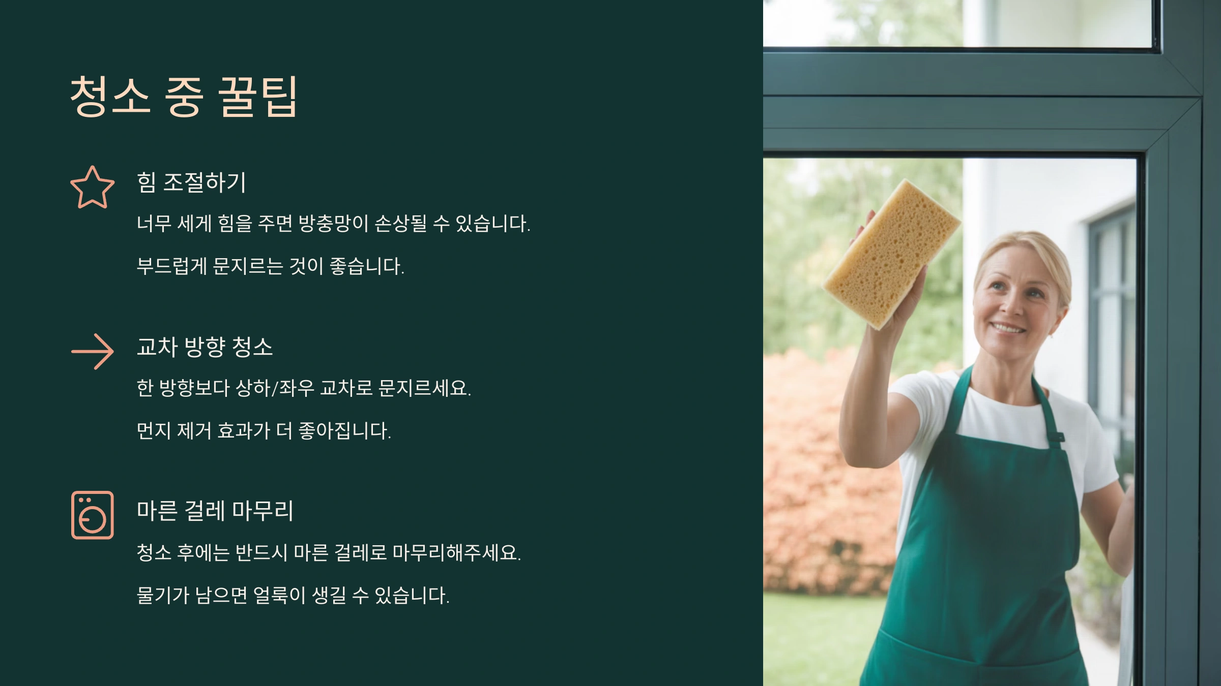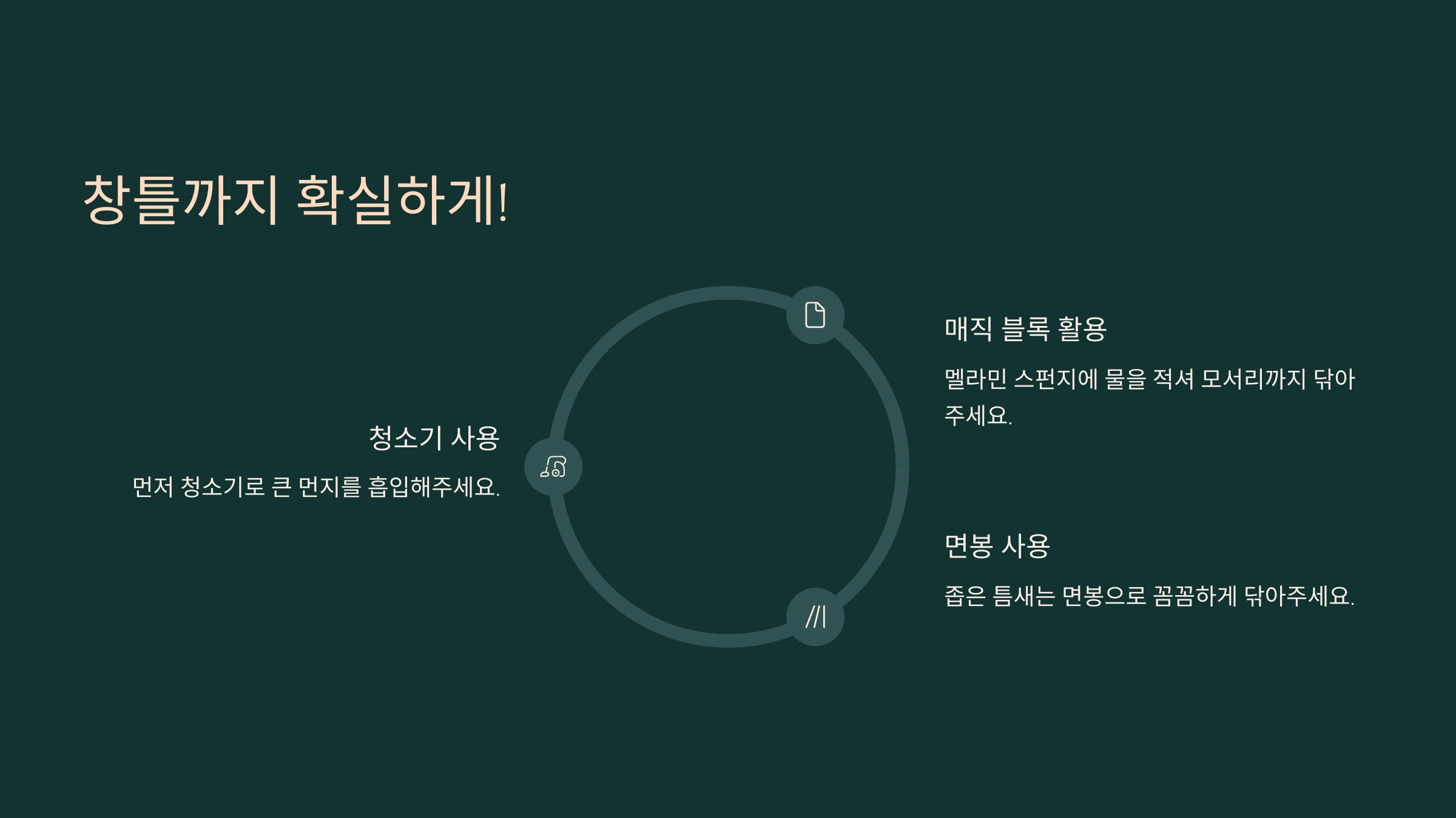 마무리로 마른 수건이나 키친타월로 물기를 닦아주면 끝이에요! 선풍기 바람이나 자연 건조도 좋지만, 바로 창문을 열면 먼지가 다시 붙을 수 있으니 건조될 때까지는 닫아두는 게 좋아요. 🌬