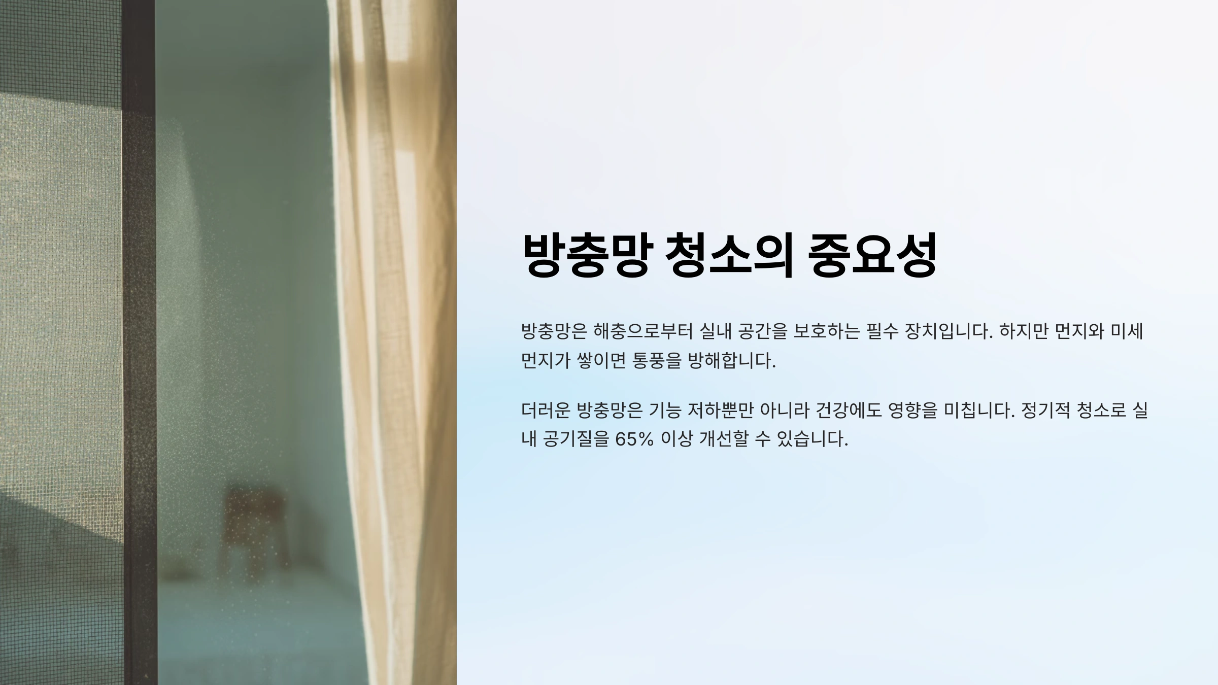 방충망은 하루에도 수십 번씩 바람이 통과하는 곳이에요. 그만큼 먼지, 미세먼지, 꽃가루, 벌레까지 쌓이기 쉽고, 이걸 방치하면 환기할 때 오히려 실내 공기를 더럽히는 주범이 될 수 있어요.