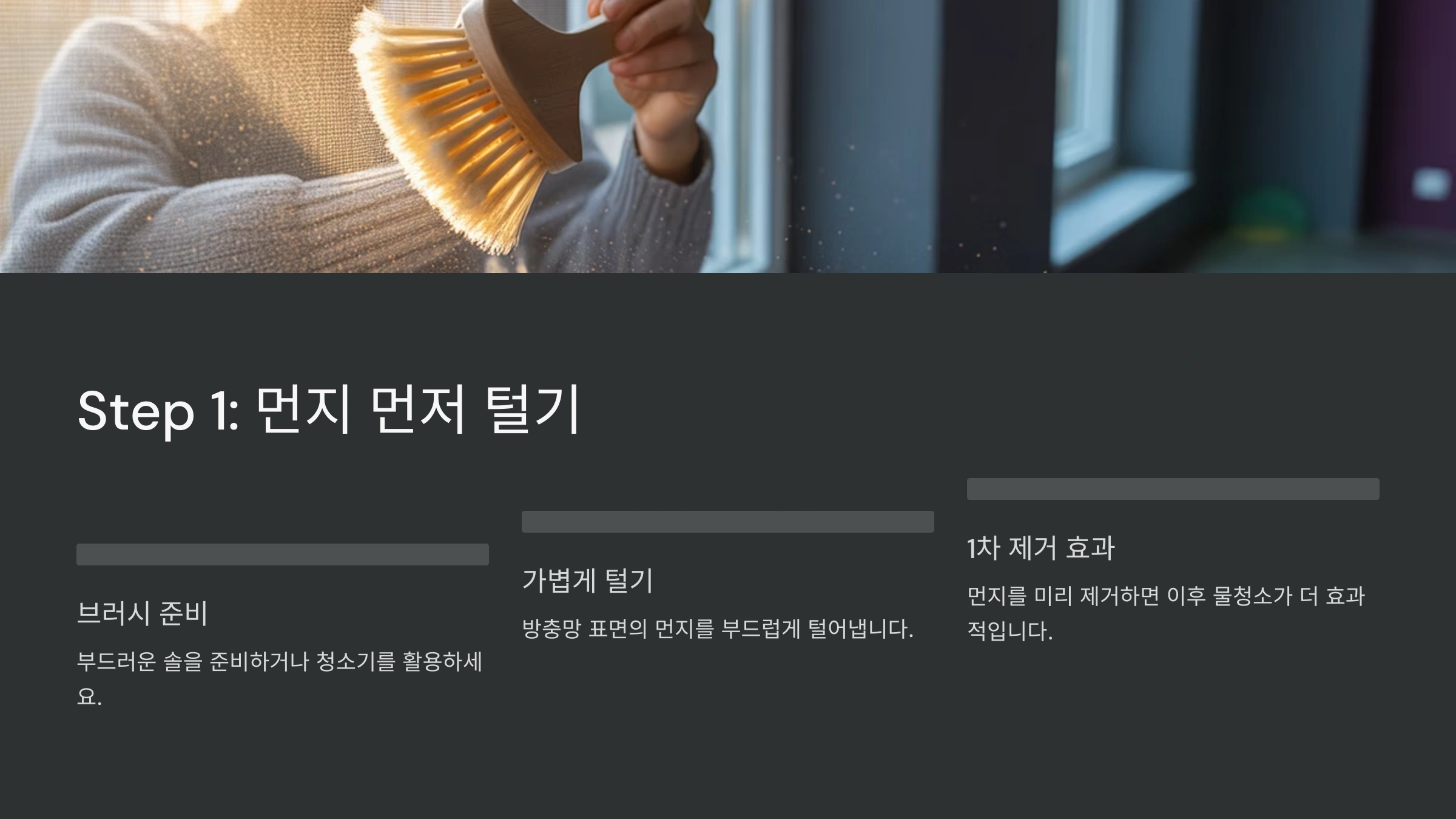 💡 이렇게 중요한 방충망, 이젠 무조건 닦아야겠다는 생각 들지 않으세요? 그런데 힘들고 어려우면 안 되잖아요! 그래서 이제 바로 이어질 다음 박스에서 **방충망 청소에 필요한 도구**부터 간단히 정리해드릴게요!