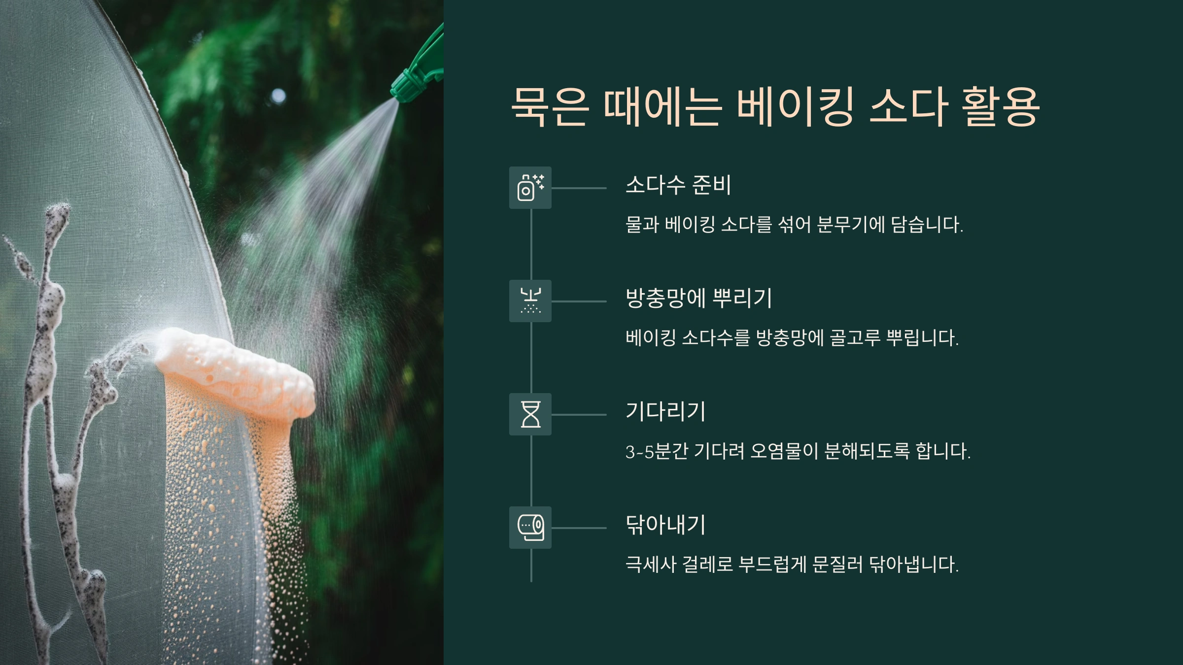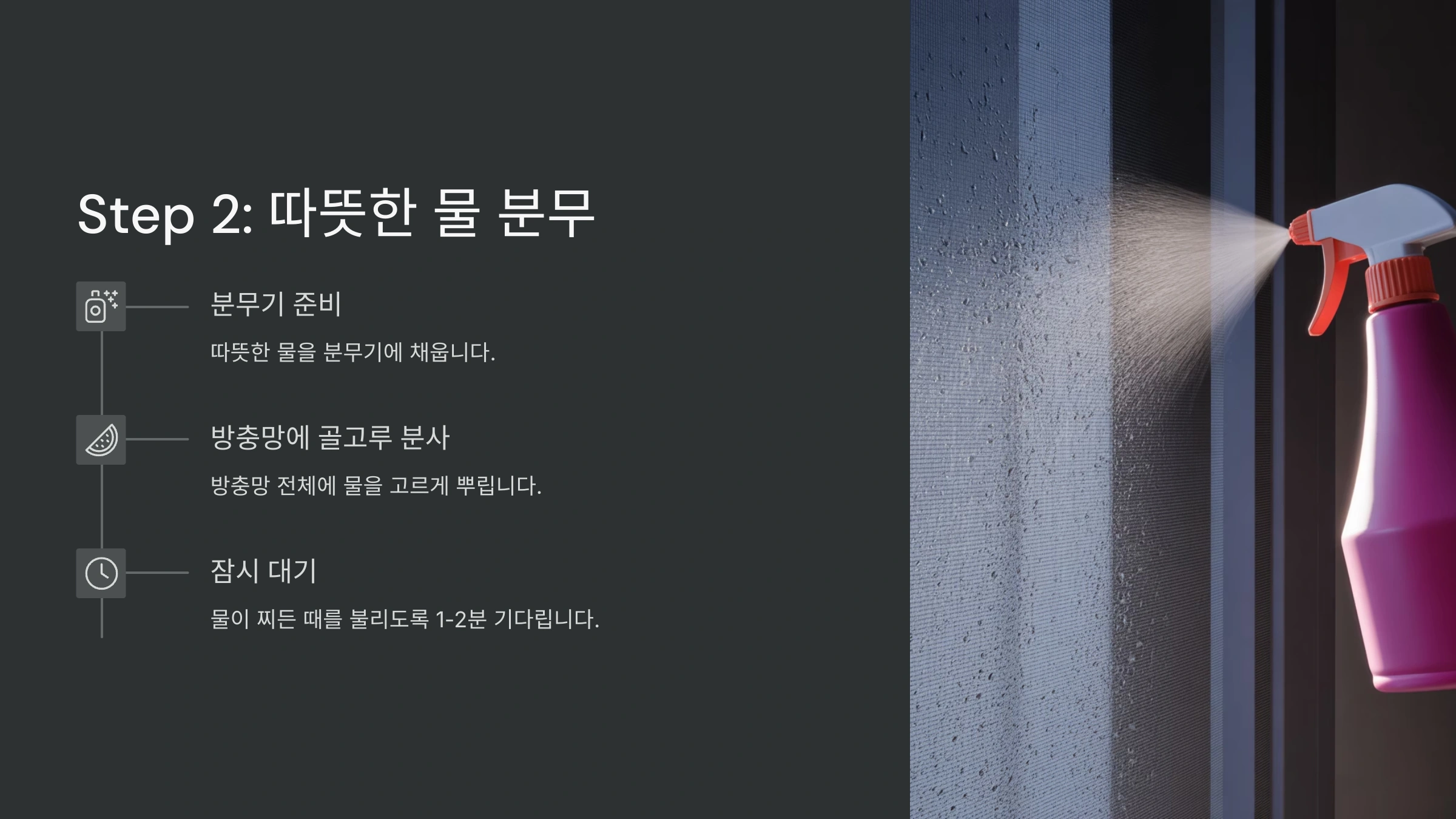먼저 분무기에 **물 + 중성세제 또는 식초**를 넣어주세요. 세제는 10:1 비율로 희석하면 되고, 식초는 살균 효과까지 있어요. 향에 민감하다면 베이킹소다도 괜찮아요. 이 용액을 방충망 양쪽에 고르게 뿌려주세요.
