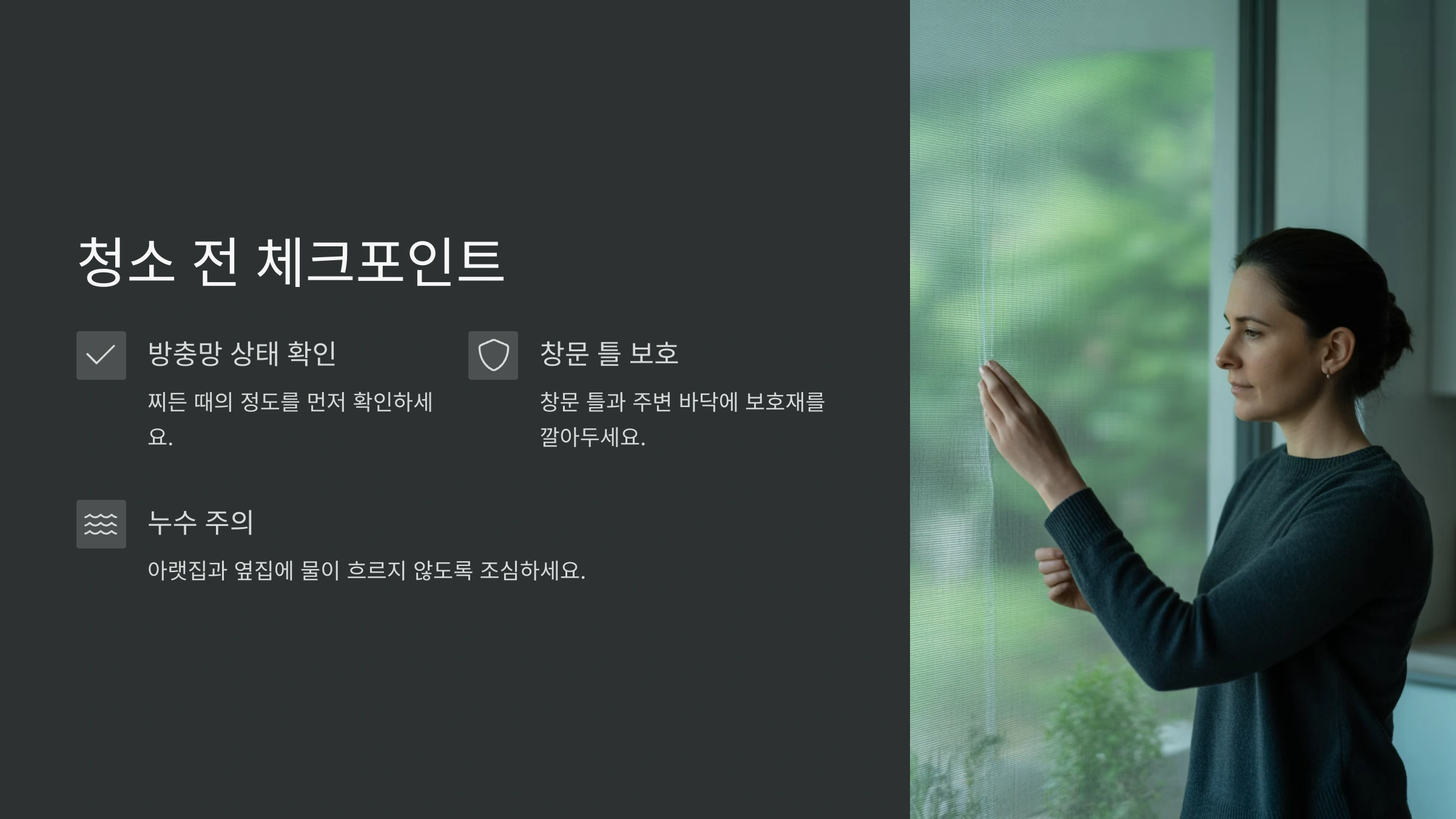 A7. 물로 닦은 경우에는 최소 30분 이상 건조 후에 창문을 열어야 해요. 마르지 않은 상태에서 창문을 열면 먼지가 다시 붙을 수 있어요.