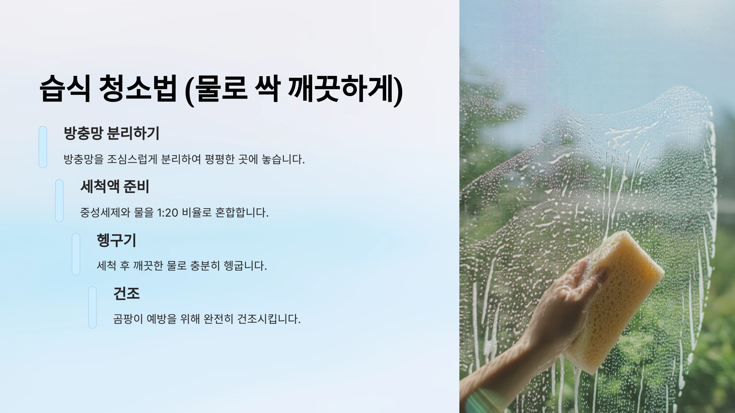 💧 방충망이 너무 오래되어 찌든 먼지가 껴 있거나, 황사와 꽃가루, 기름때까지 묻어 있다면 물과 세제를 활용한 습식 청소가 최고예요! 이 방법은 방충망을 떼지 않고도 집 안에서 완벽하게 닦아낼 수 있어요.