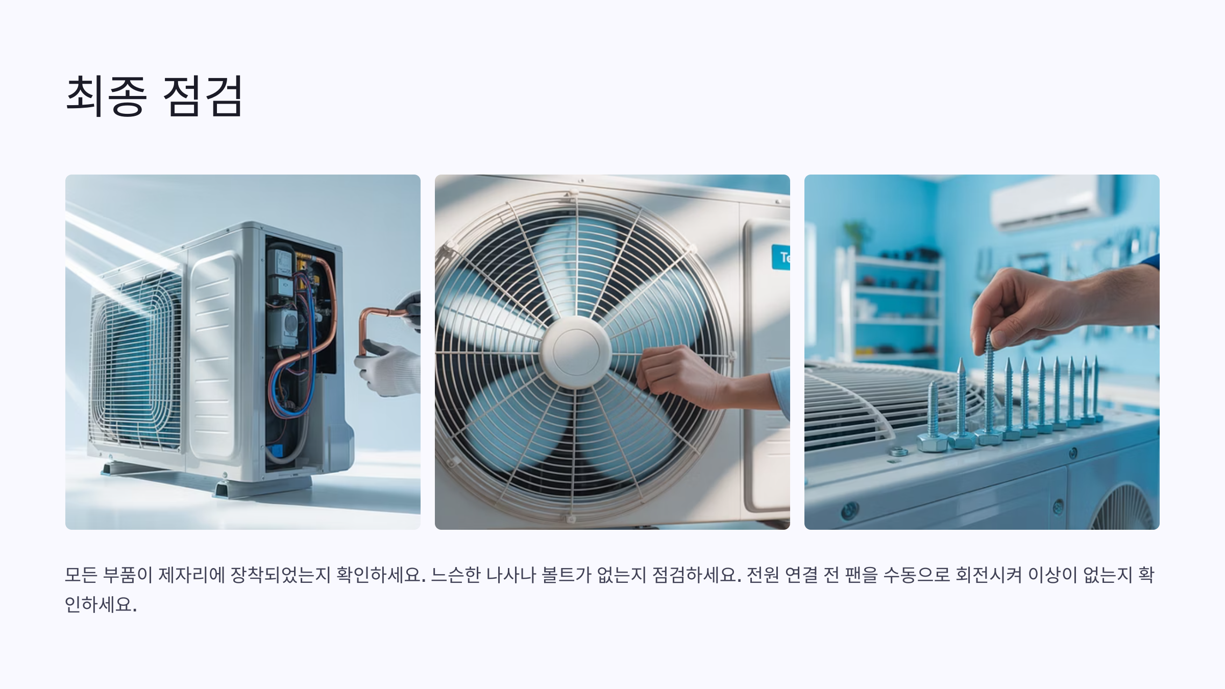| 2 | 팬모터 및 배선 연결 | 헐거움 방지, 화재 위험 주의 |