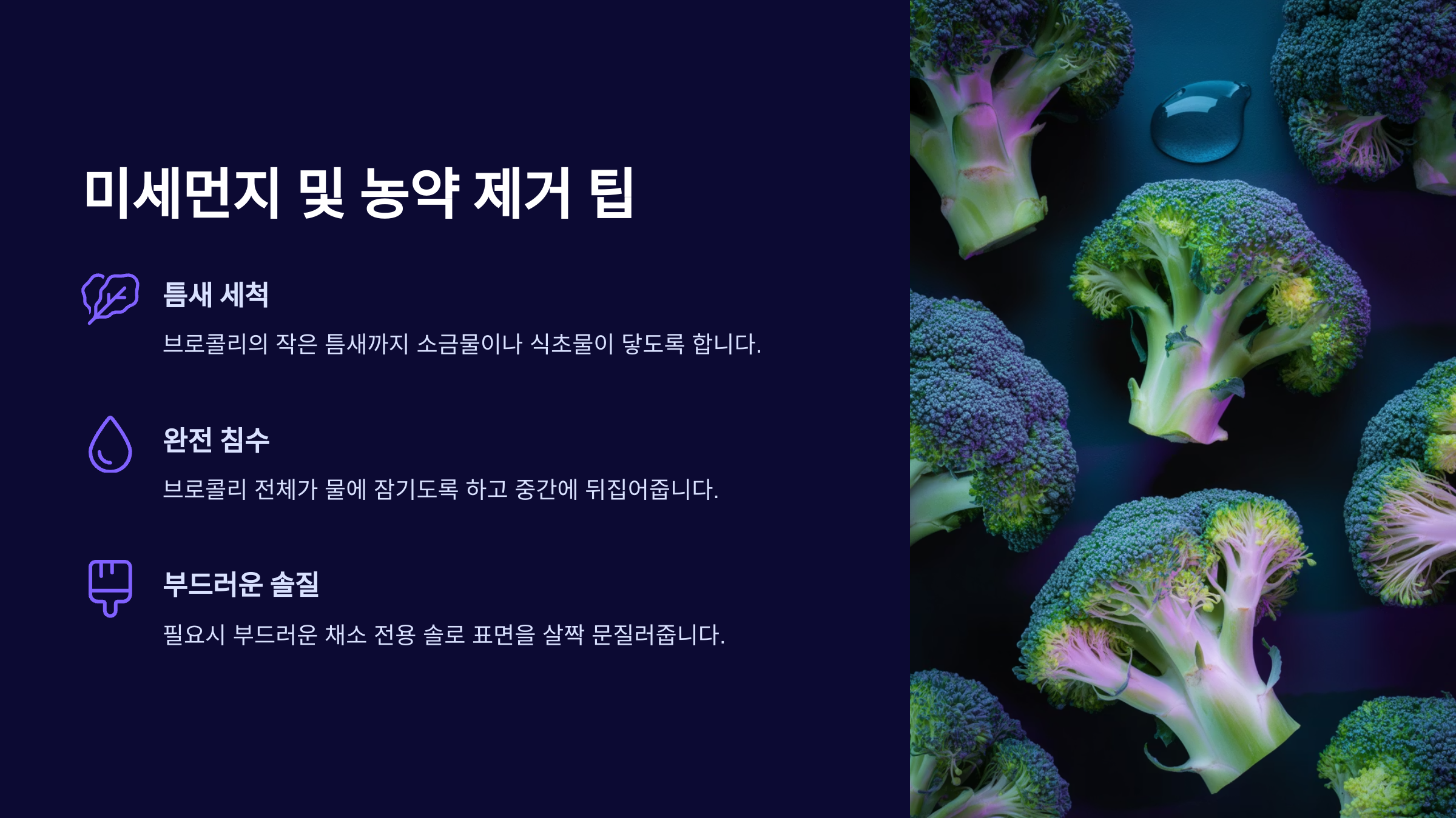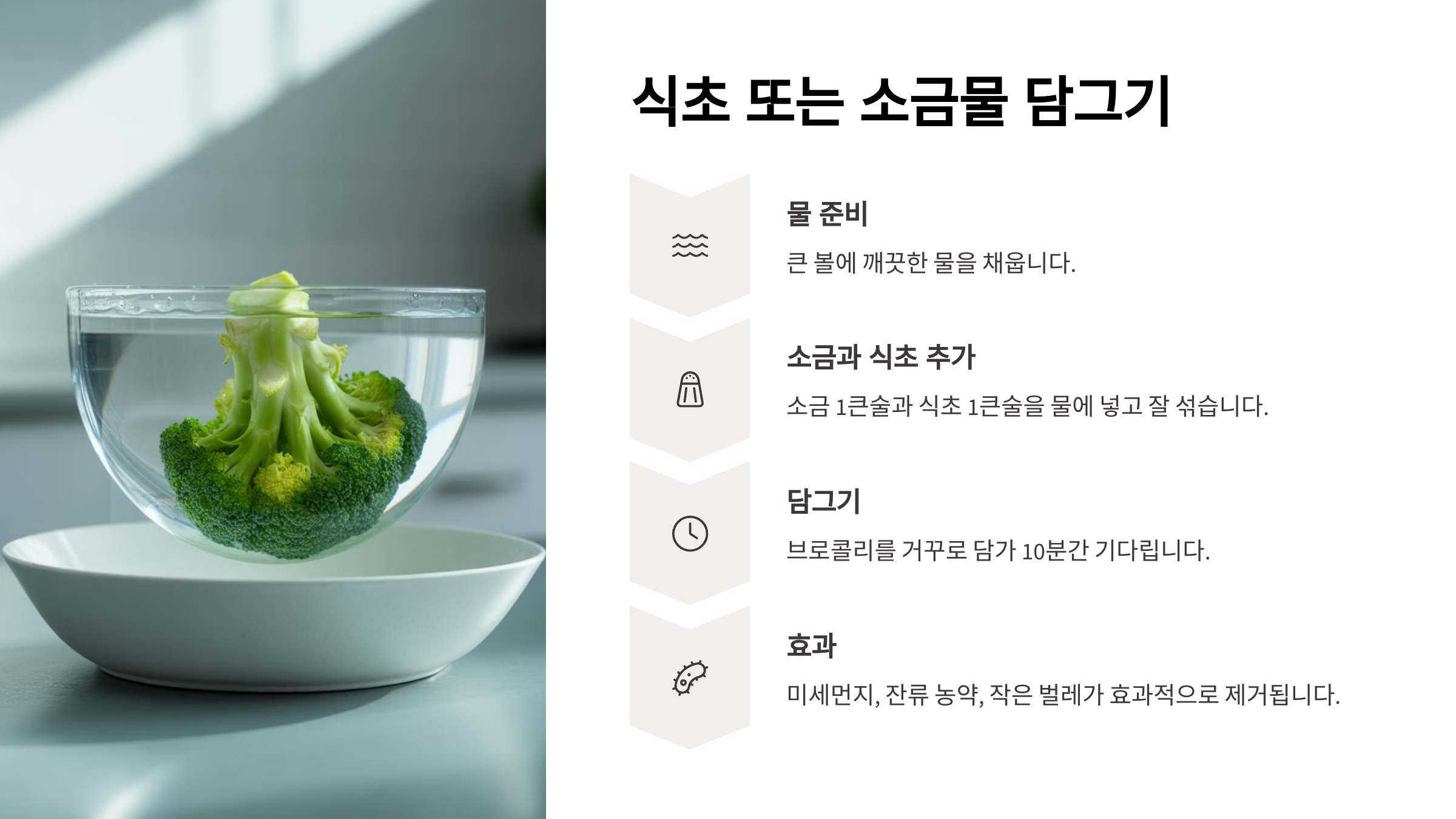 아무리 몸에 좋은 브로콜리라도, 씻는 방법이 올바르지 않으면 잔류 농약이나 벌레 걱정을 안 할 수가 없죠. 제가 여러 정보를 찾아보고 직접 해본 결과, 가장 효과적인 세척 단계를 알려드릴게요!