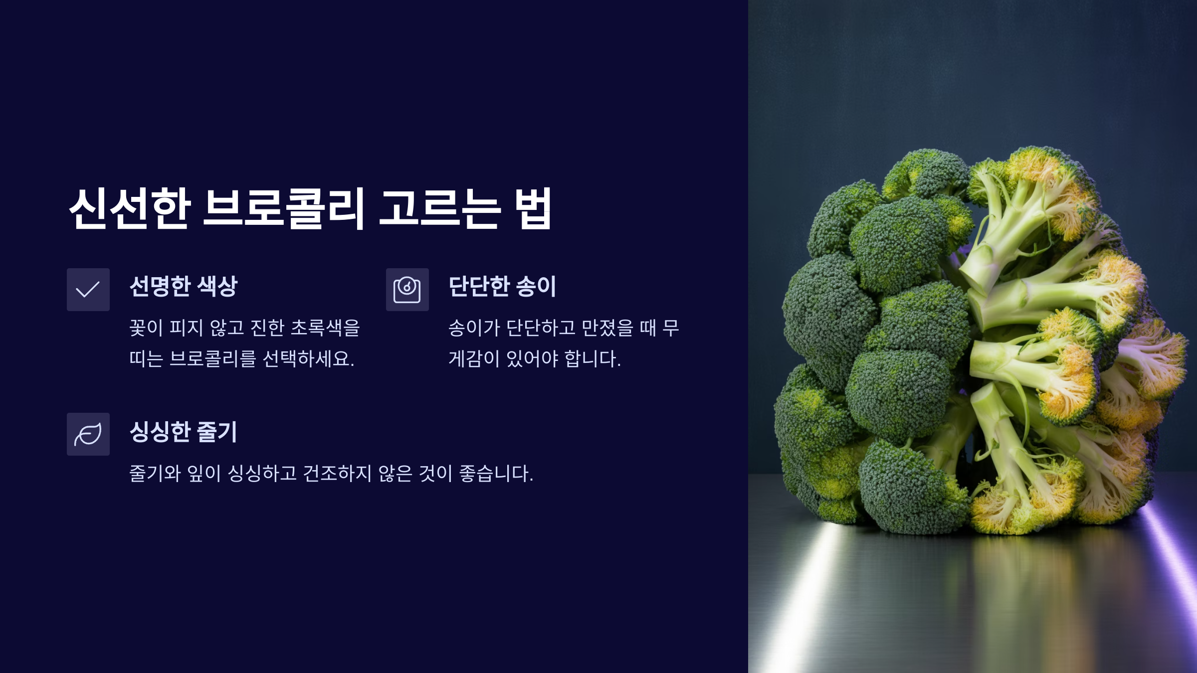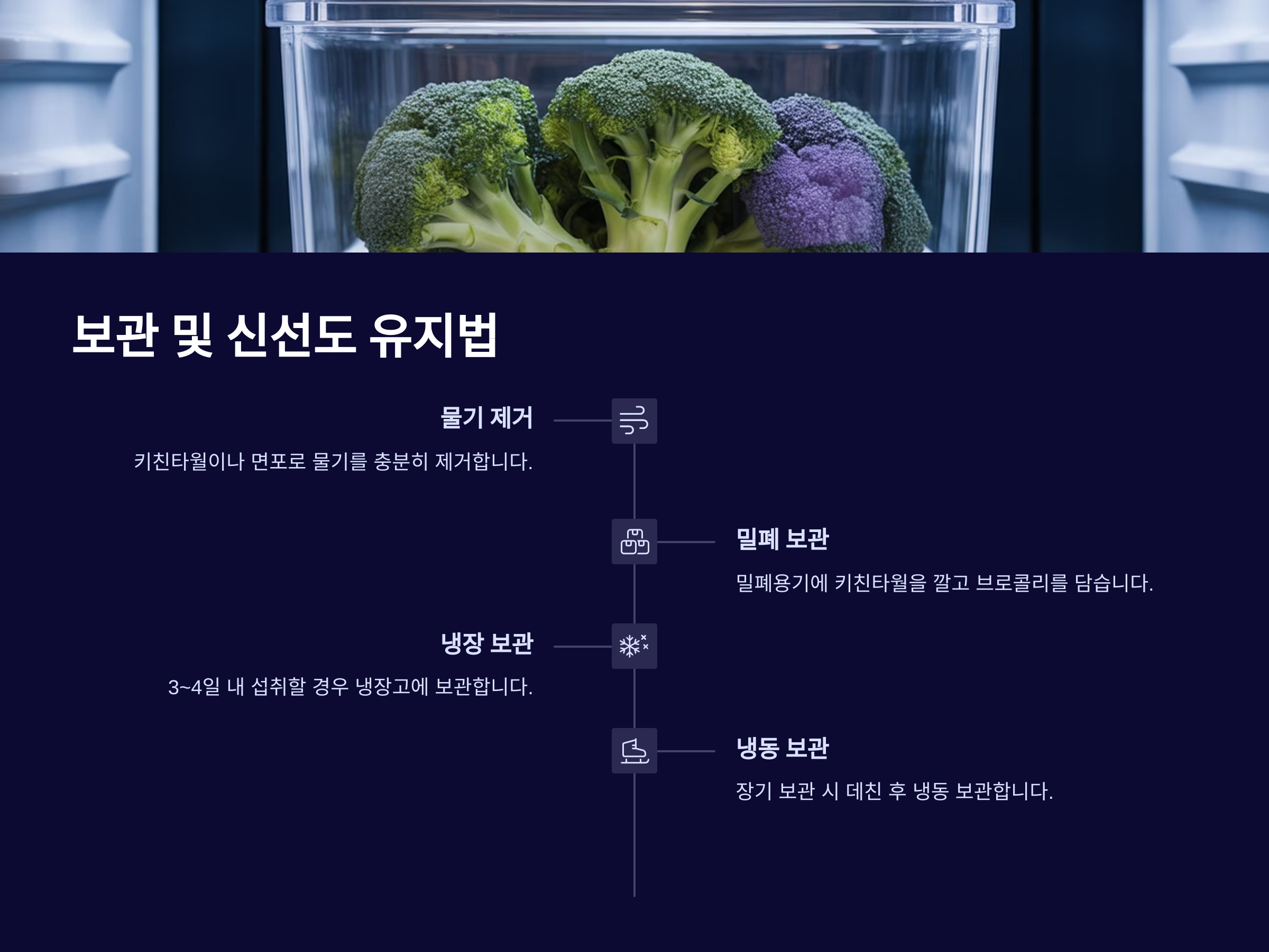 - 신선하게 보관하는 방법: 브로콜리는 잘못 보관하면 금방 시들거나 꽃이 피어버릴 수 있어요. 키친타월이나 랩으로 감싸서 냉장고 채소칸에 보관하면 며칠간 신선함을 유지할 수 있습니다. 더 오래 보관하고 싶다면 살짝 데친 후 물기를 제거하고 밀폐 용기에 담아 냉동 보관하세요.