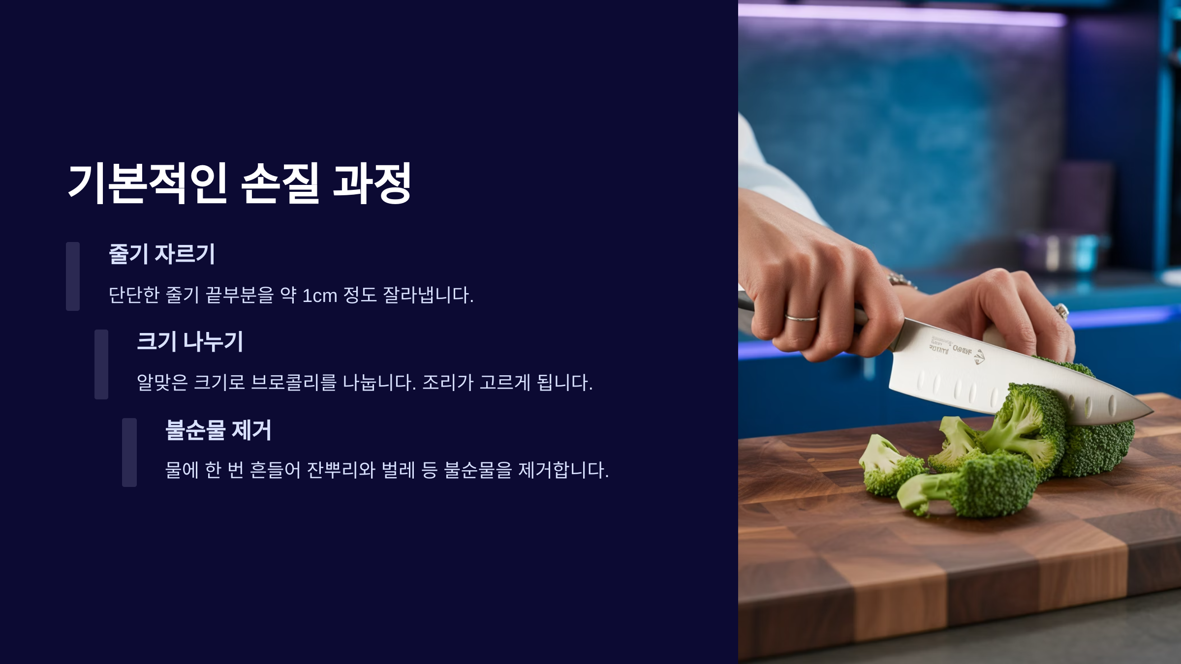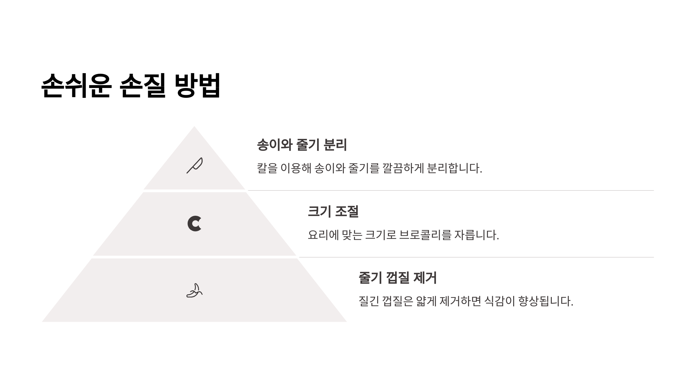 - 줄기까지 알뜰하게 활용하기: 위에서도 잠깐 언급했지만, 브로콜리 줄기 부분도 영양이 아주 풍부해요! 겉의 질긴 껍질은 감자칼 등으로 벗겨내고, 안쪽의 부드러운 부분은 송이와 함께 요리에 활용해 보세요. 볶음 요리나 수프에 넣으면 아삭한 식감을 더해준답니다.
