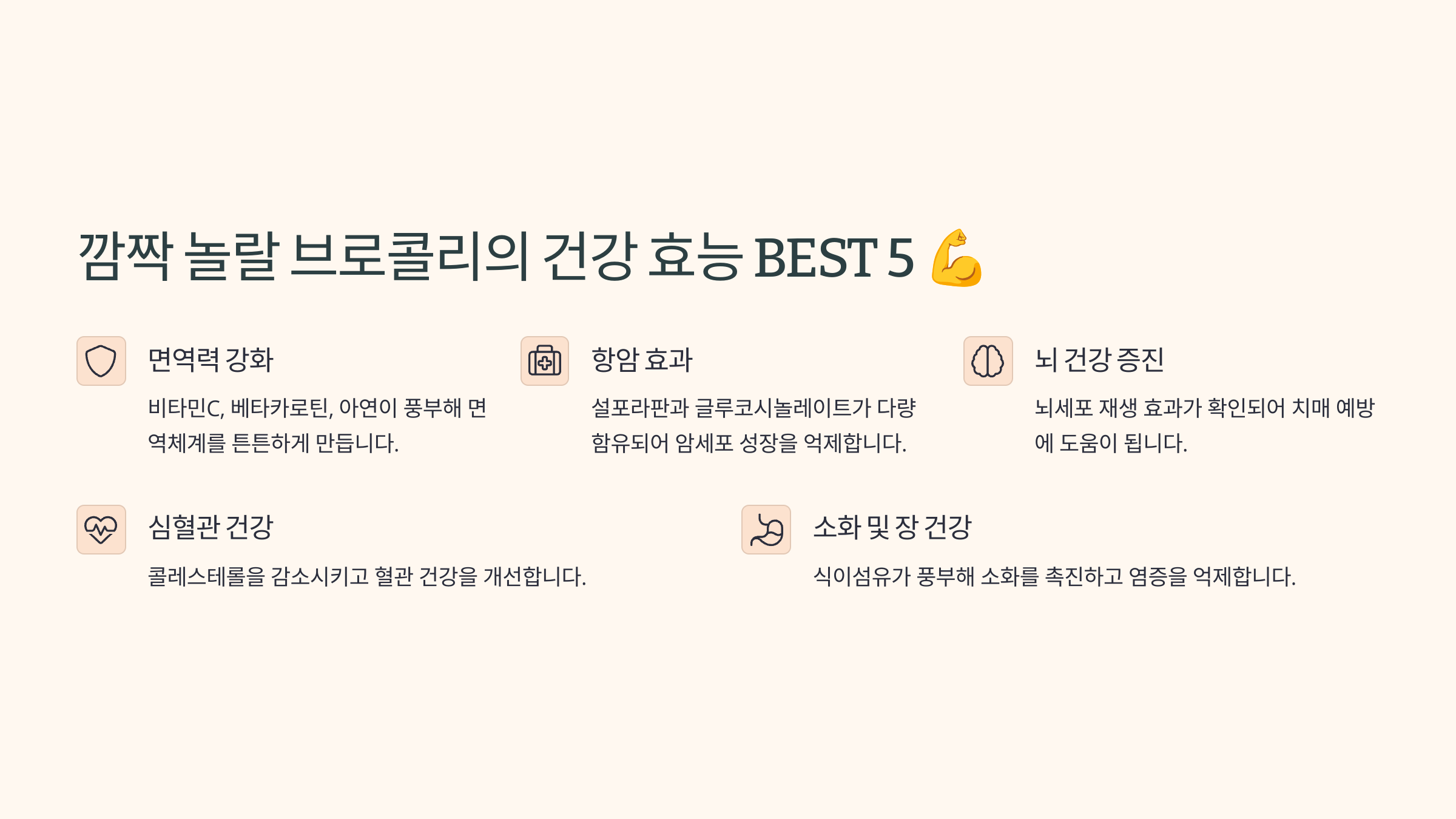 깨끗하게 씻은 브로콜리, 이제 그 놀라운 효능들을 알아볼 차례죠! 브로콜리가 우리 몸에 어떤 좋은 영향을 주는지, 대표적인 효능 5가지를 꼽아봤어요.