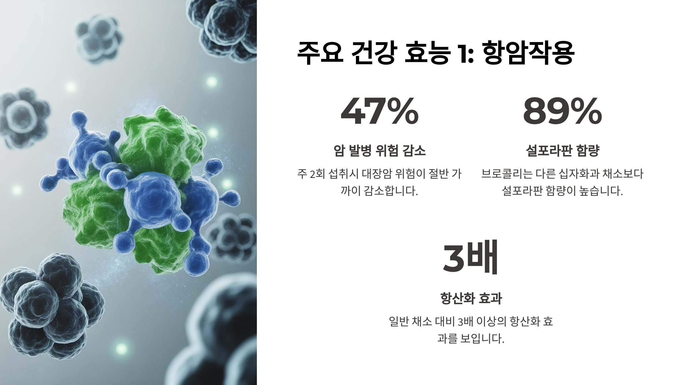 - 강력한 항암 효과 🛡: 브로콜리에는 설포라판과 인돌-3-카비놀 같은 성분이 풍부해요. 이 성분들은 암세포의 성장을 억제하고 사멸을 유도하는 등 강력한 항암 작용을 하는 것으로 알려져 있답니다. 특히 유방암, 전립선암, 대장암 예방에 효과적이라는 연구 결과들이 많아요.
