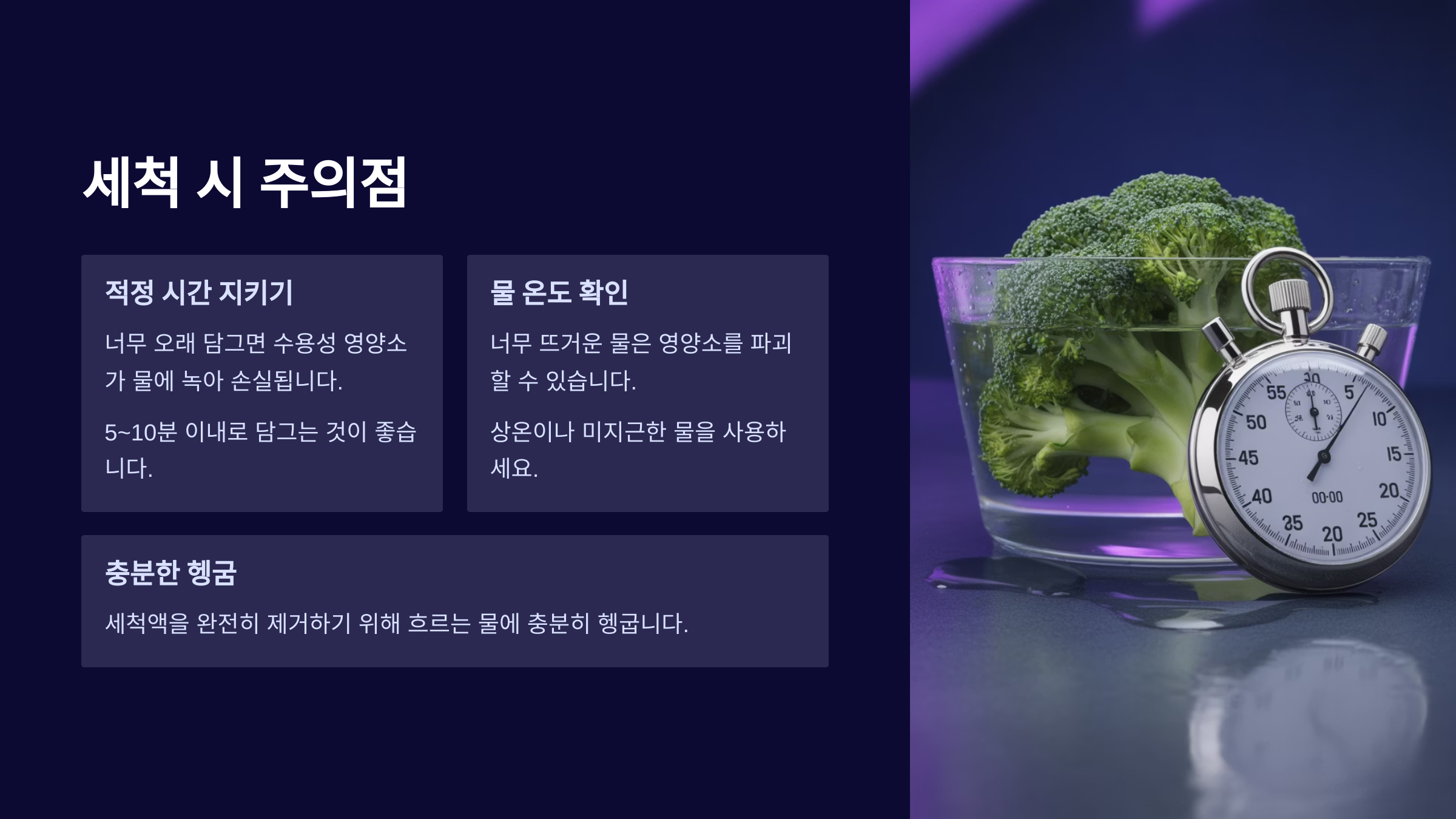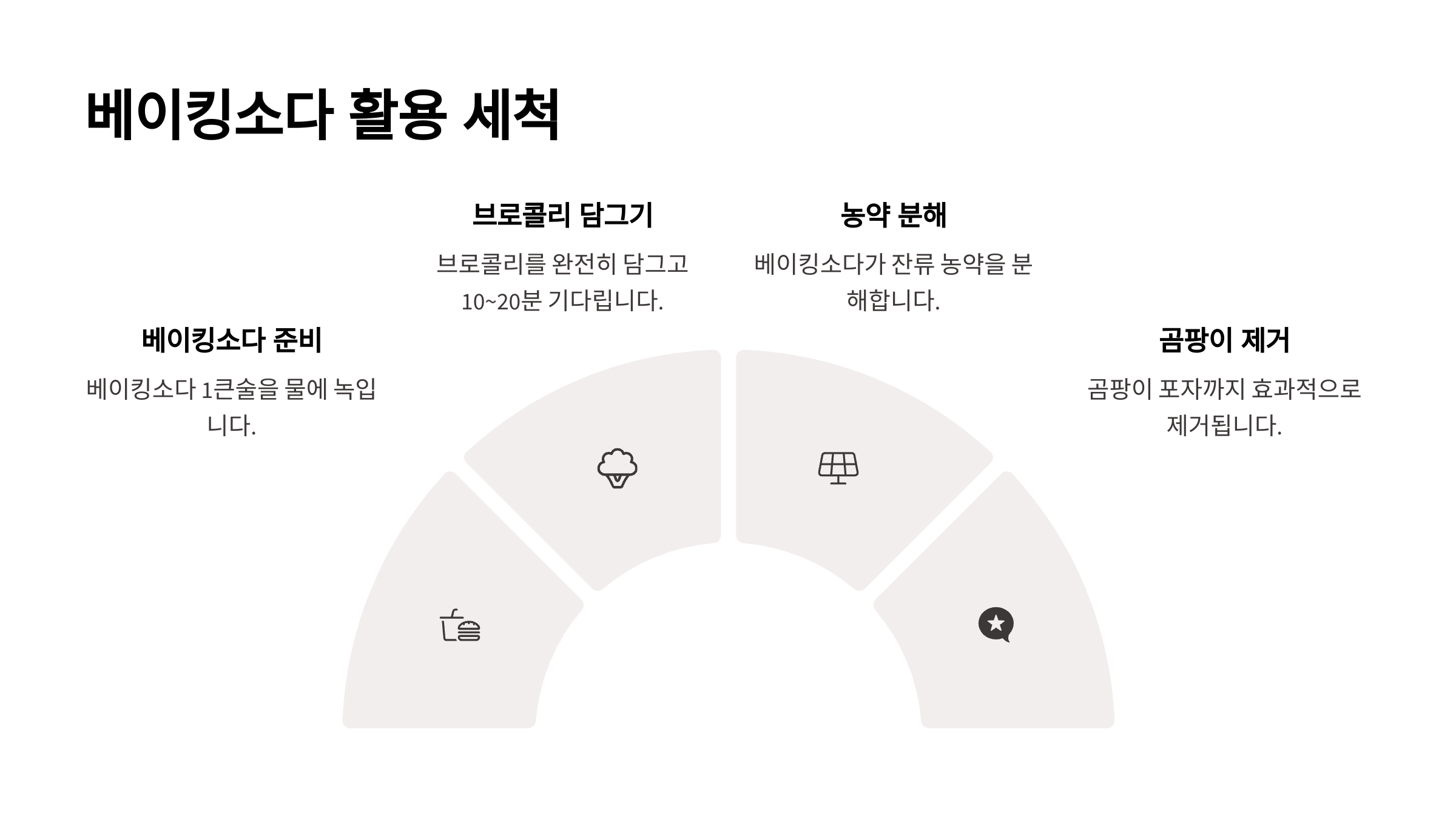 좀 더 꼼꼼하게 세척하고 싶다면 베이킹소다나 식초를 활용해 보세요. 물에 베이킹소다를 1~2스푼 정도 풀거나 식초를 몇 방울 떨어뜨린 물에 브로콜리를 넣고 2~3분 정도 더 담가둡니다. 베이킹소다는 잔류 농약 제거에, 식초는 살균 효과에 도움을 줄 수 있다고 해요. 하지만 너무 오래 담가두면 비타민 손실이 있을 수 있으니 시간은 꼭 지켜주세요!