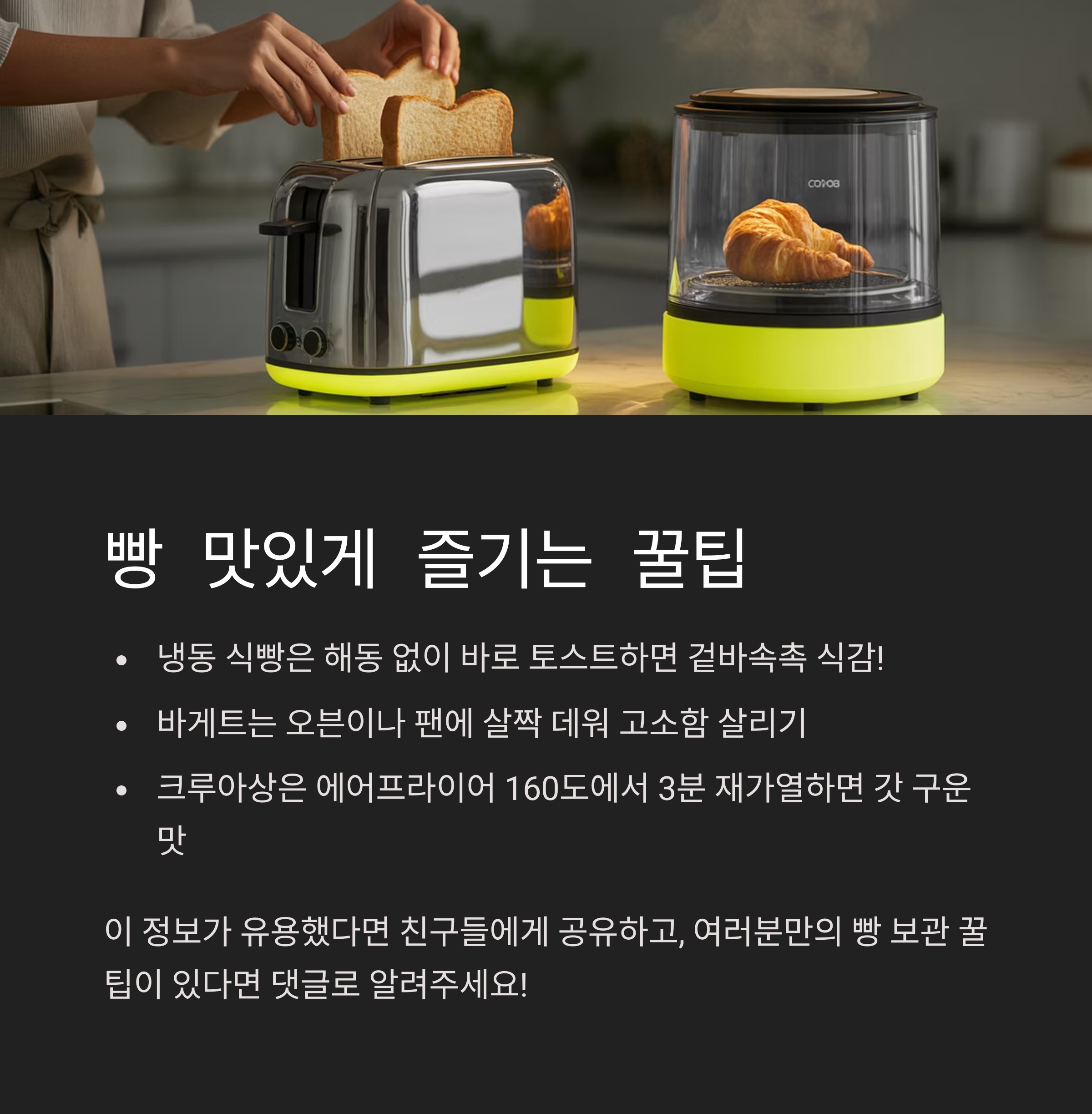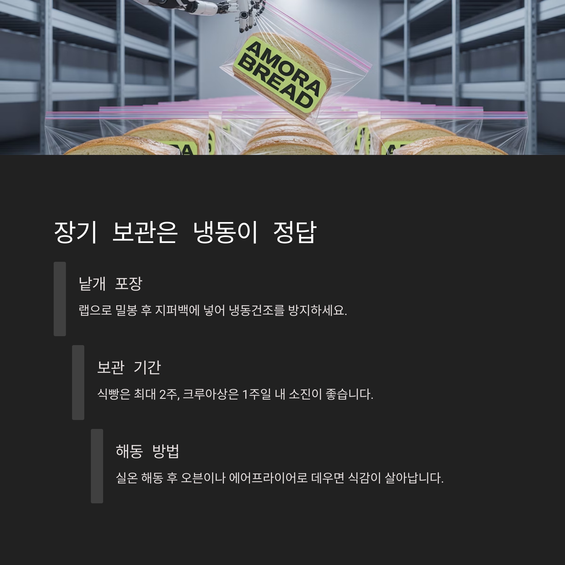 | 상온 | 식감 유지, 간편 | 곰팡이 위험, 단기 | 식빵, 바게트, 단팥빵 |