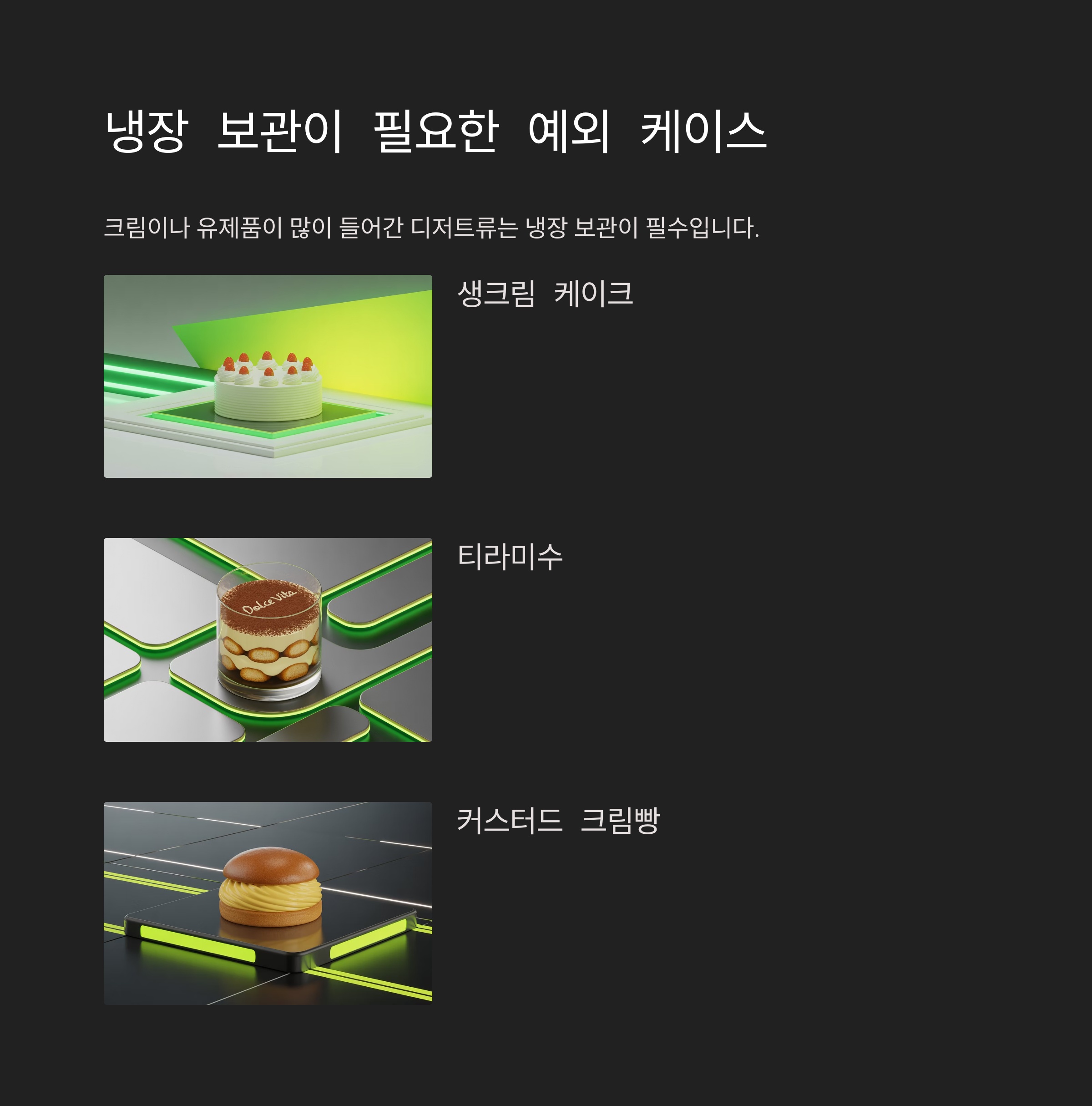 예를 들어, 크림이나 유제품이 많이 들어간 냉장 디저트류는