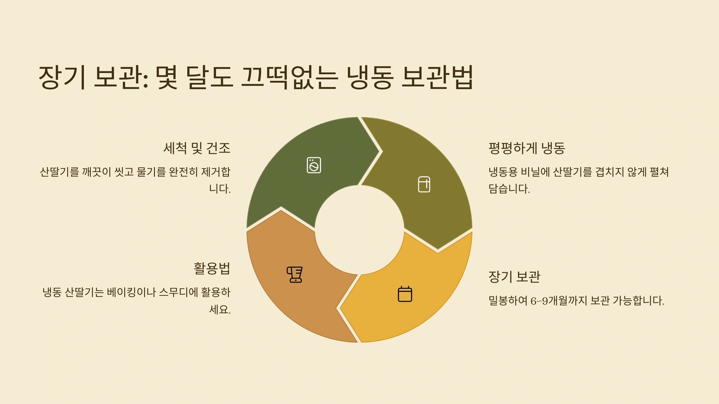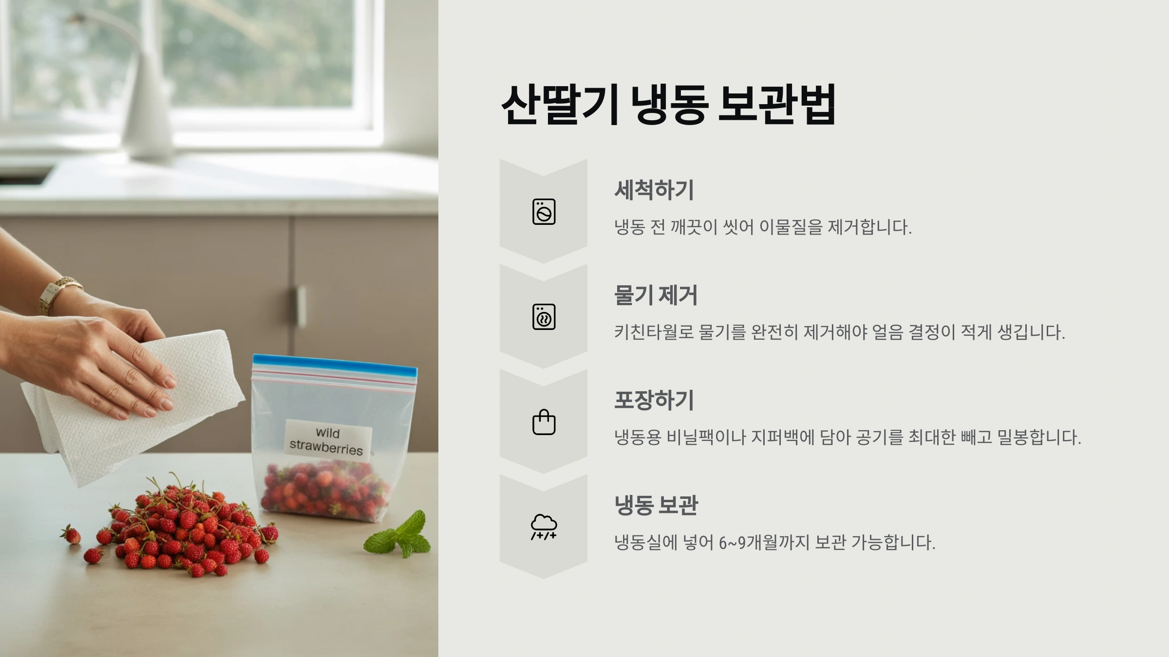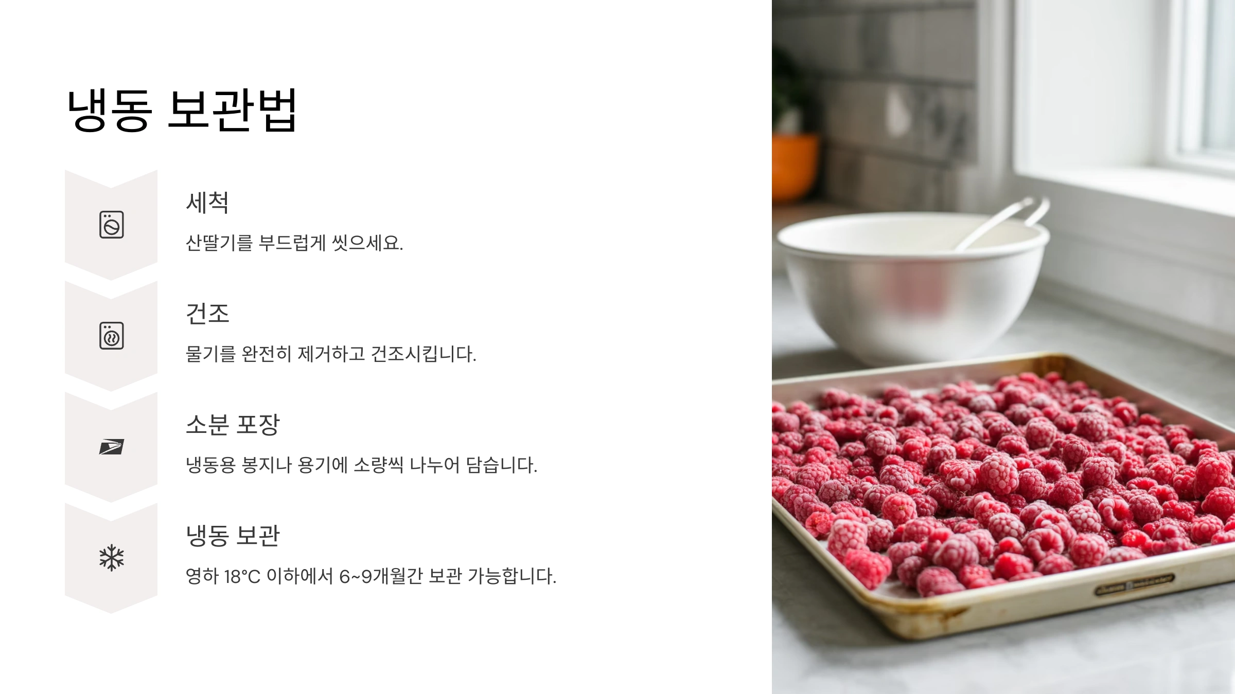 산딸기를 대량으로 구매했거나 오랫동안 두고 먹고 싶다면 냉동 보관이 정답입니다. 그냥 봉지에 담아 얼리면 나중에 거대한 '산딸기 덩어리'가 되어버리니, 조금만 신경 써서 얼려주세요. 나중에 한 알씩 쏙쏙 꺼내 쓰기 정말 편하답니다.