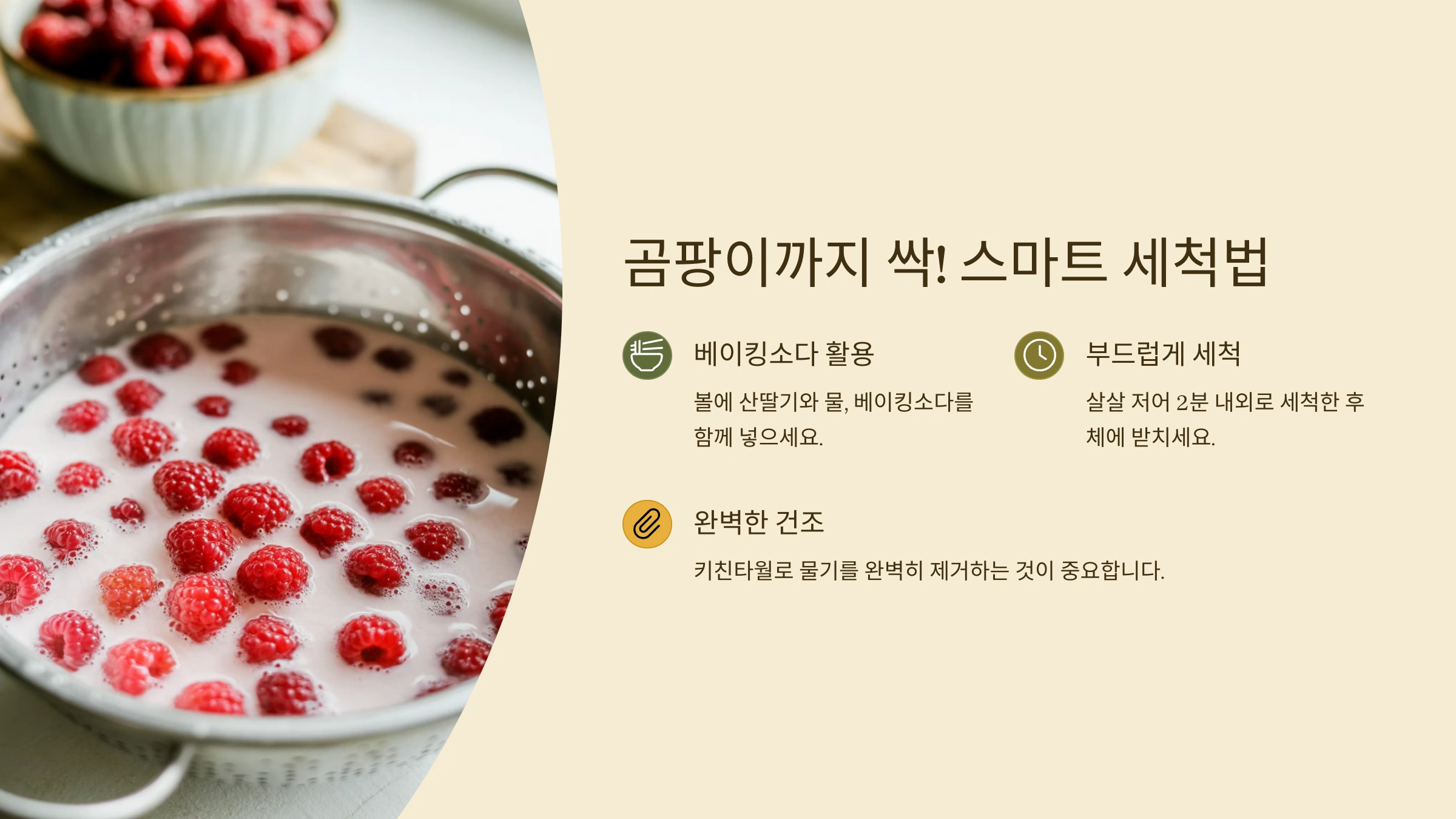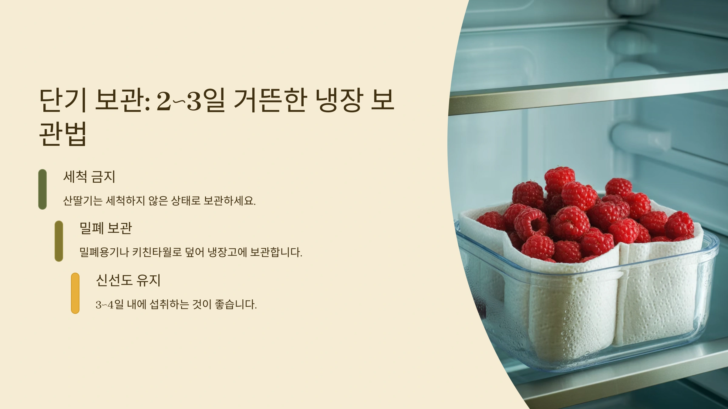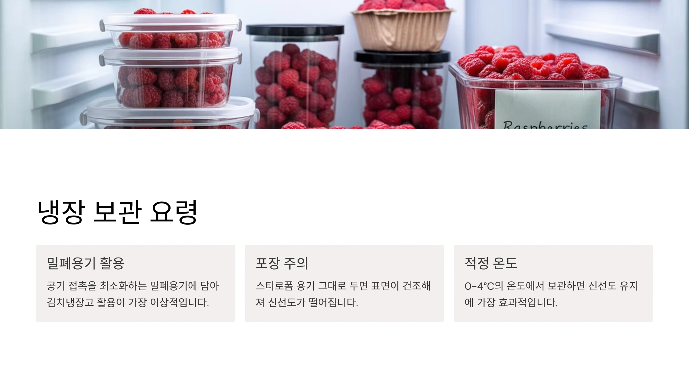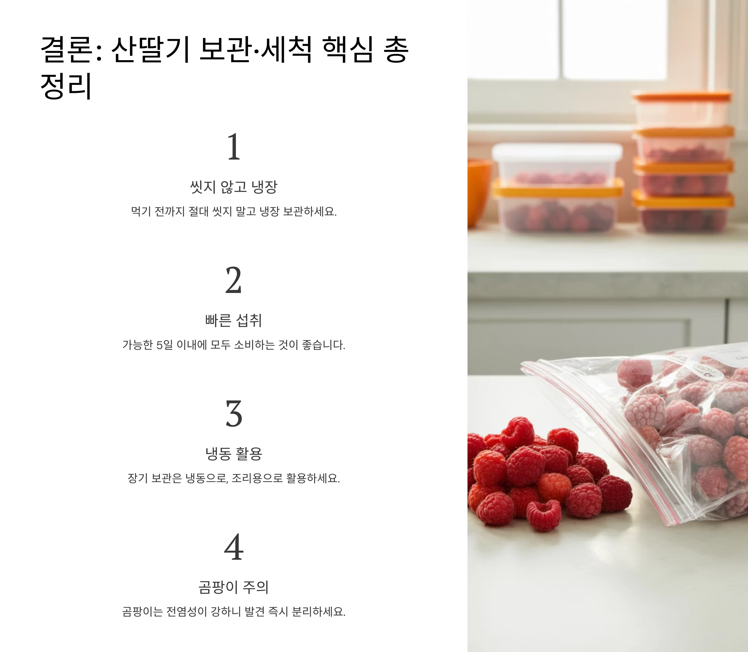 산딸기의 가장 큰 적은 '수분'과 '압력'이에요. 모든 세척법과 보관법은 이 두 가지를 어떻게 피하느냐에 달려있다고 생각하시면 이해하기 쉬워요.