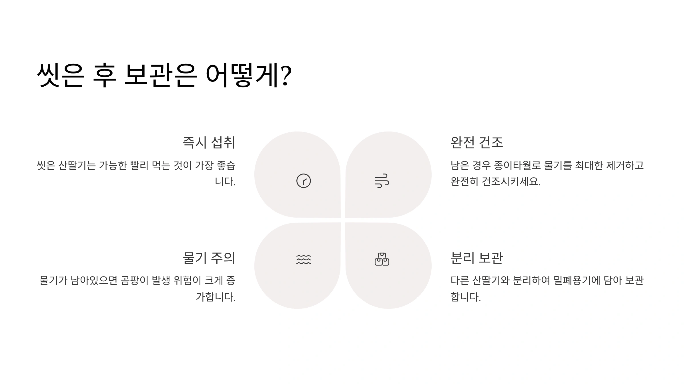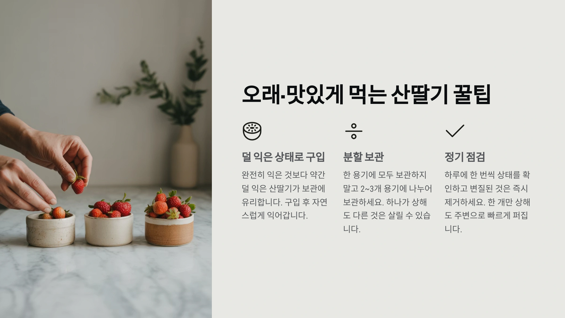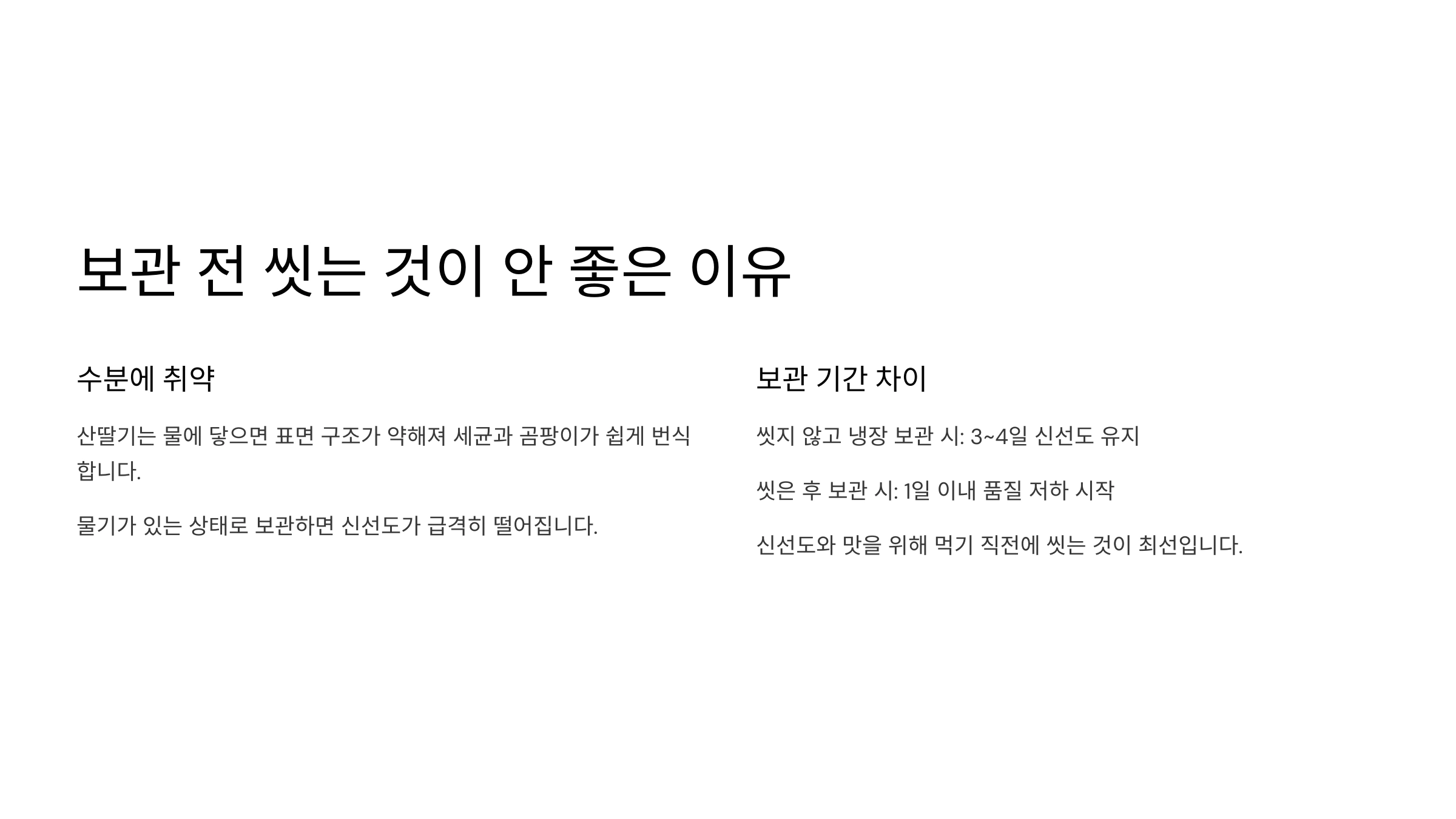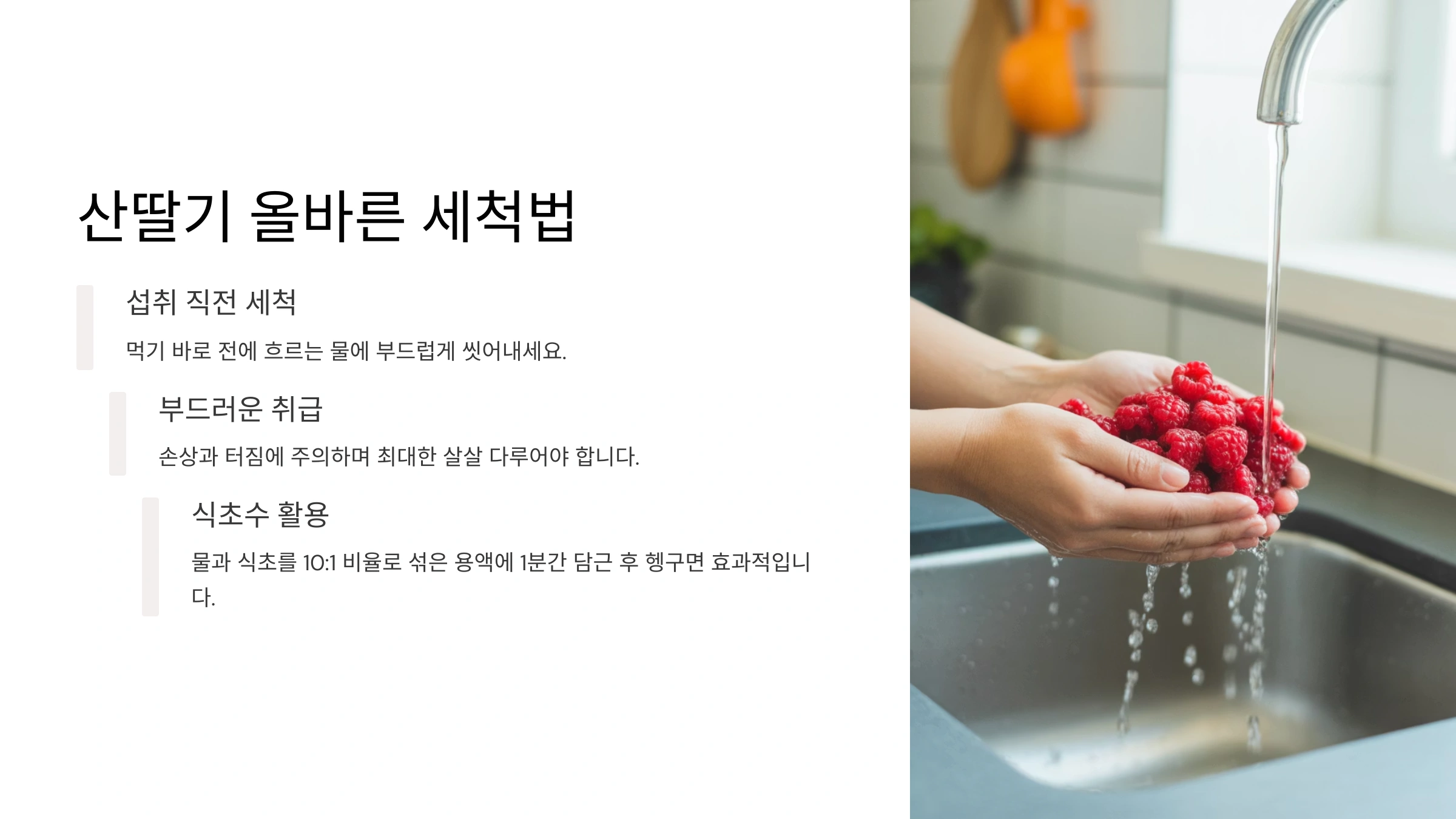 산딸기의 가장 큰 적은 '수분'과 '압력'이에요. 모든 세척법과 보관법은 이 두 가지를 어떻게 피하느냐에 달려있다고 생각하시면 이해하기 쉬워요.