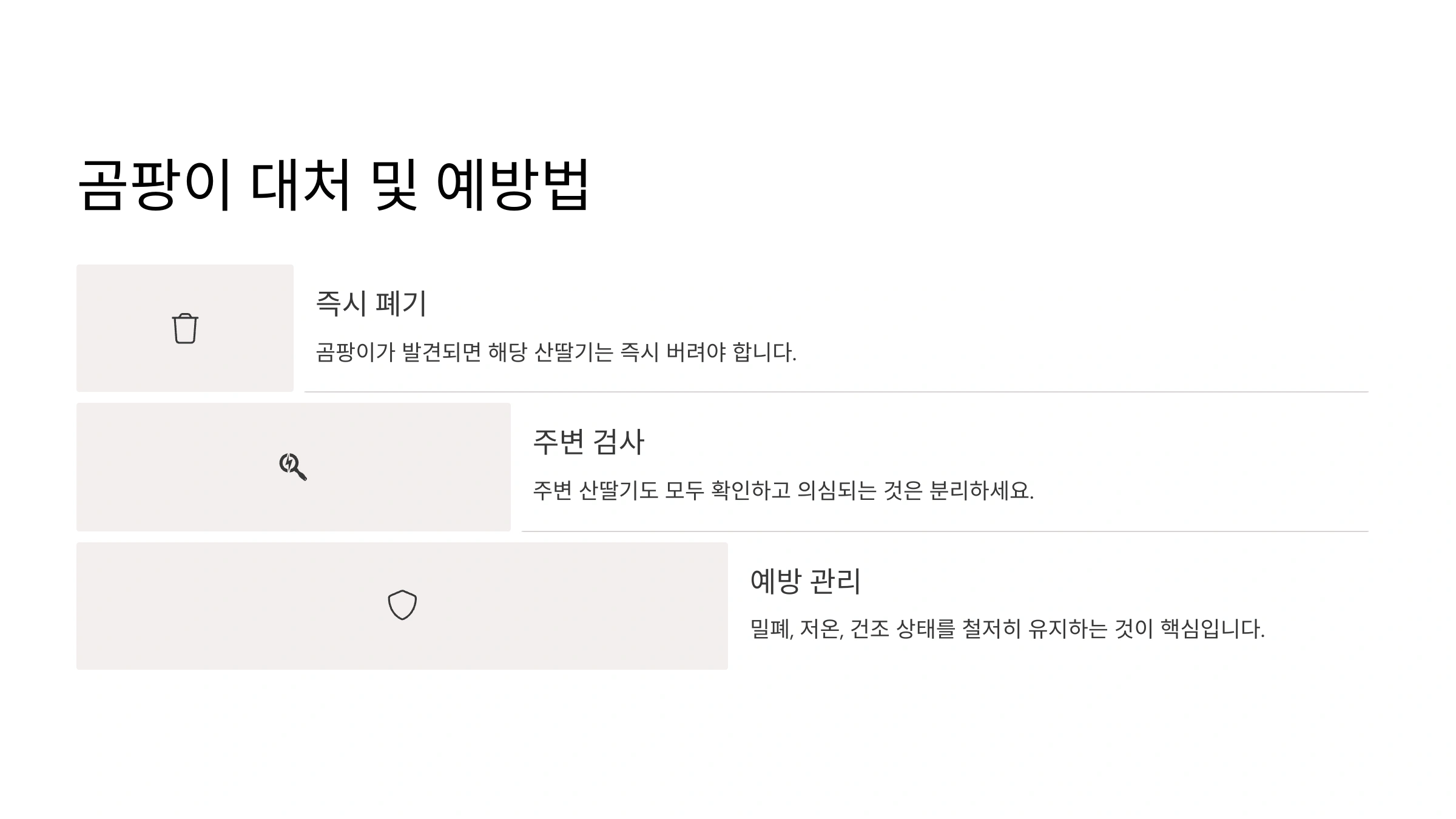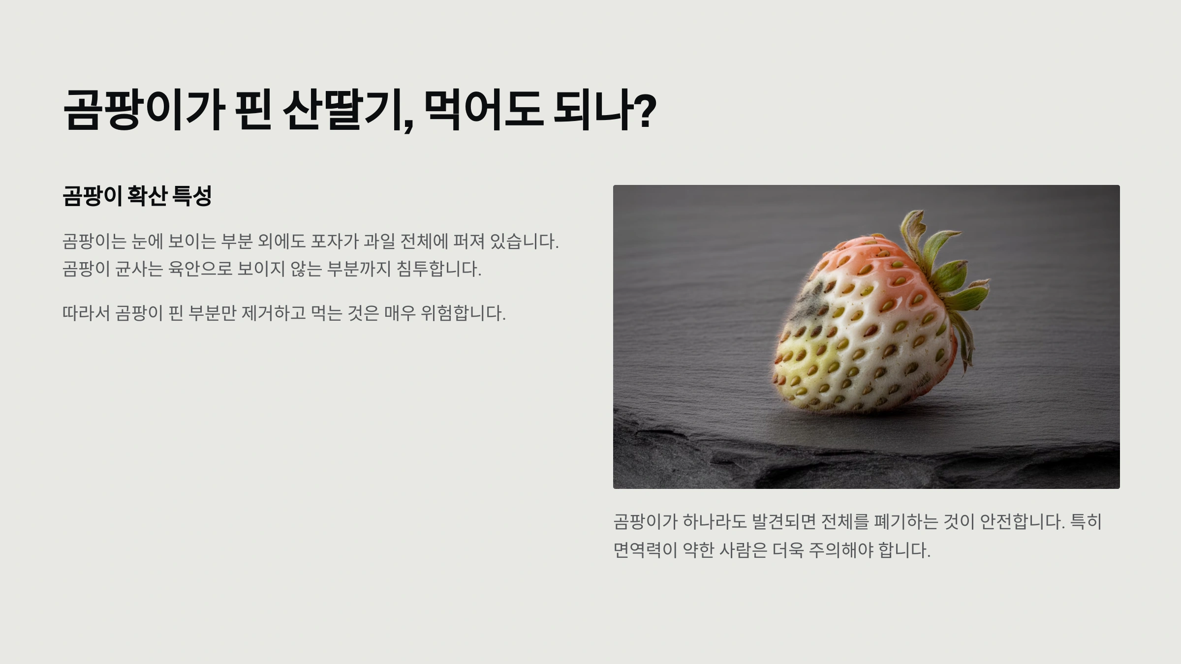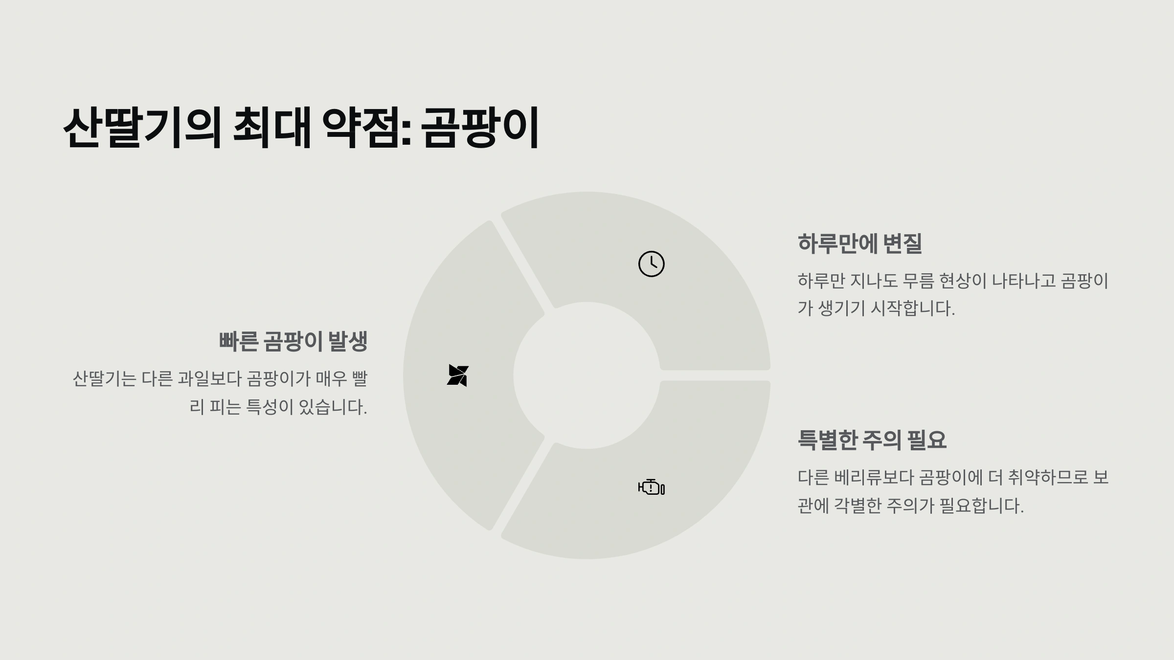 한두 개에만 곰팡이가 피었다고 해서 그것만 골라내고 나머지를 드시면 안 돼요! 곰팡이는 눈에 보이지 않는 포자로 주변 과일에 쉽게 퍼져나가기 때문에, 곰팡이가 핀 산딸기와 그 주변에 닿아있던 것들은 아까워도 과감히 버리는 것이 안전합니다.