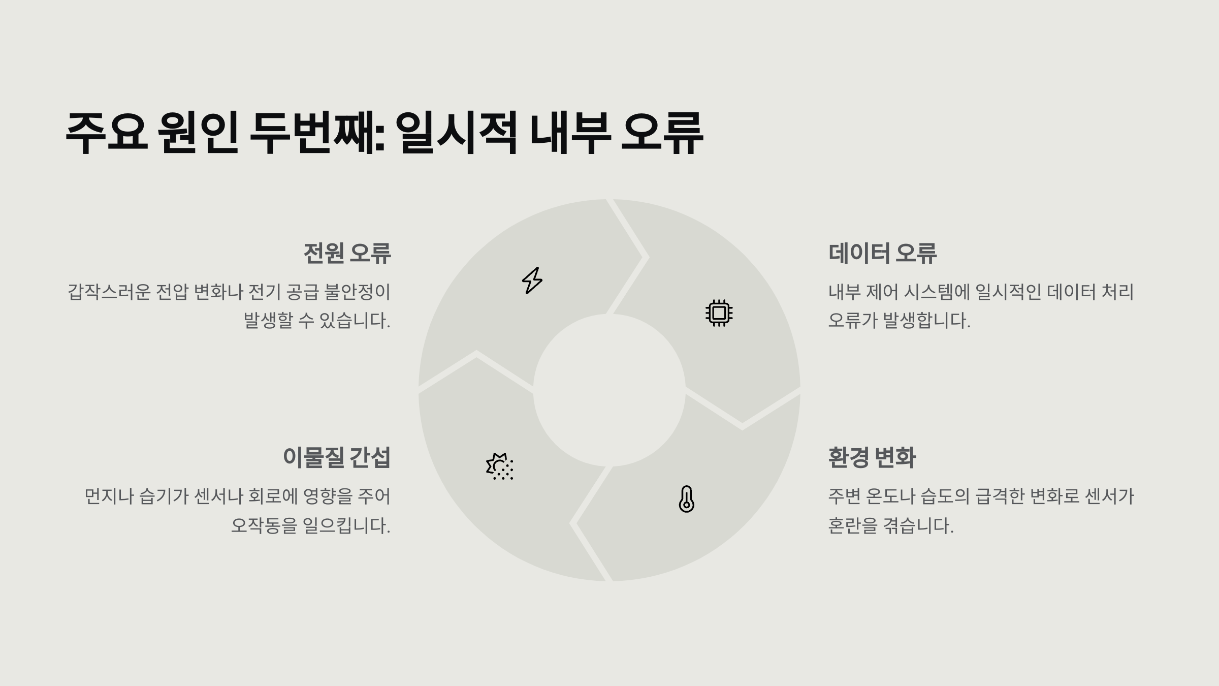 | 일시적인 시스템 오류 | 내부 프로그램이 순간적으로 꼬여 센서 값을 잘못 읽어오는 경우입니다. | 높음 (자가 해결 가능) |