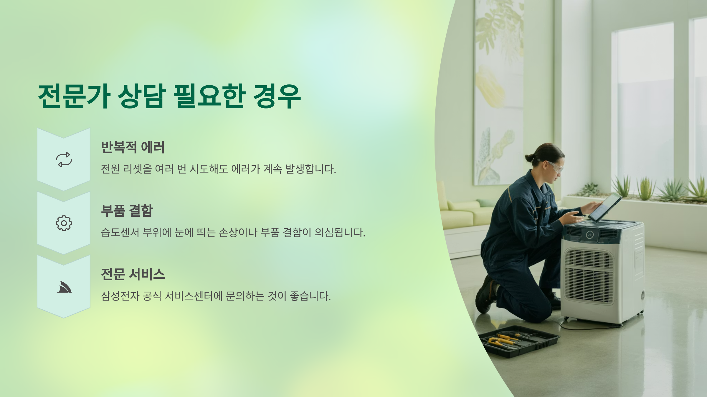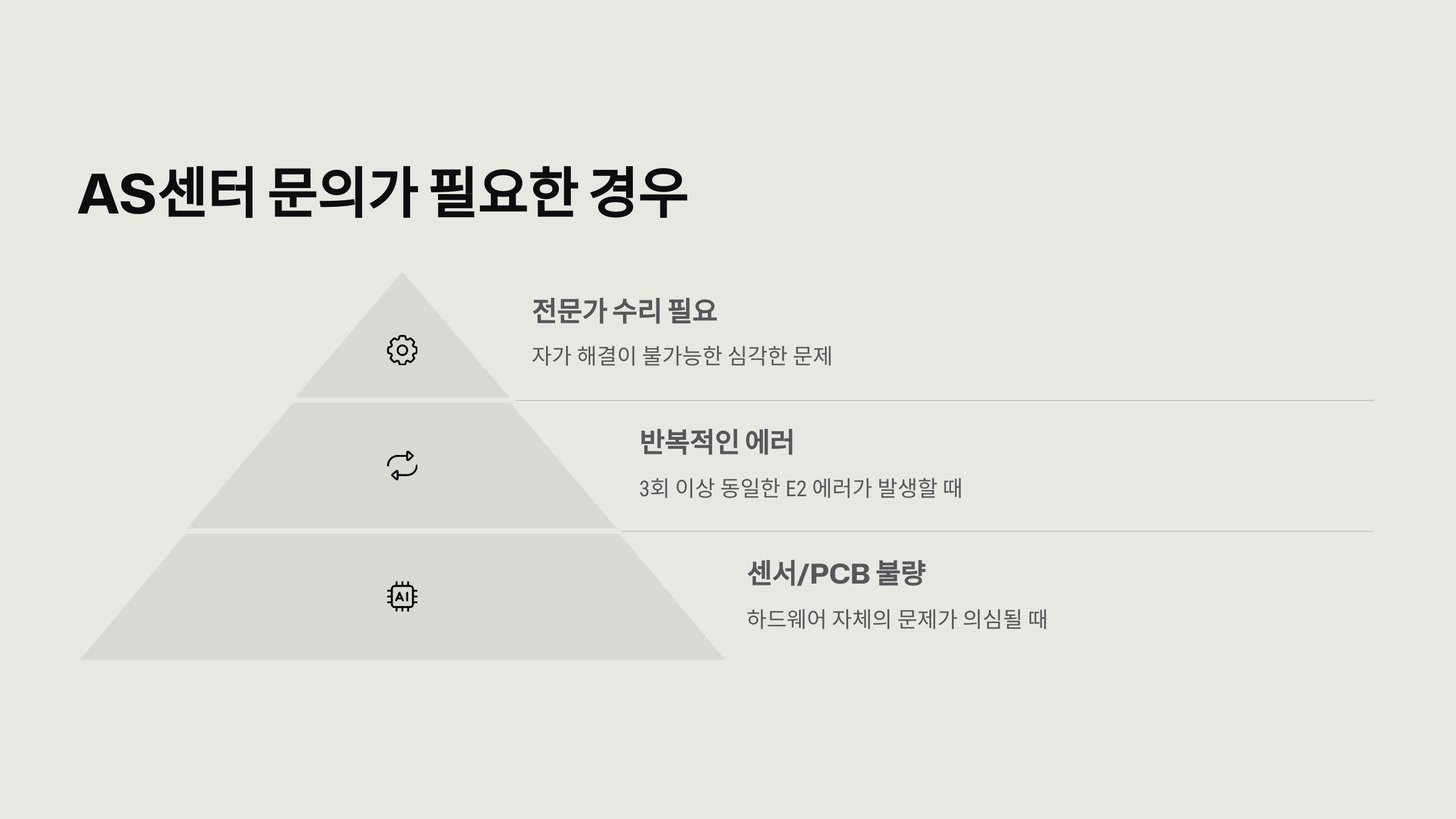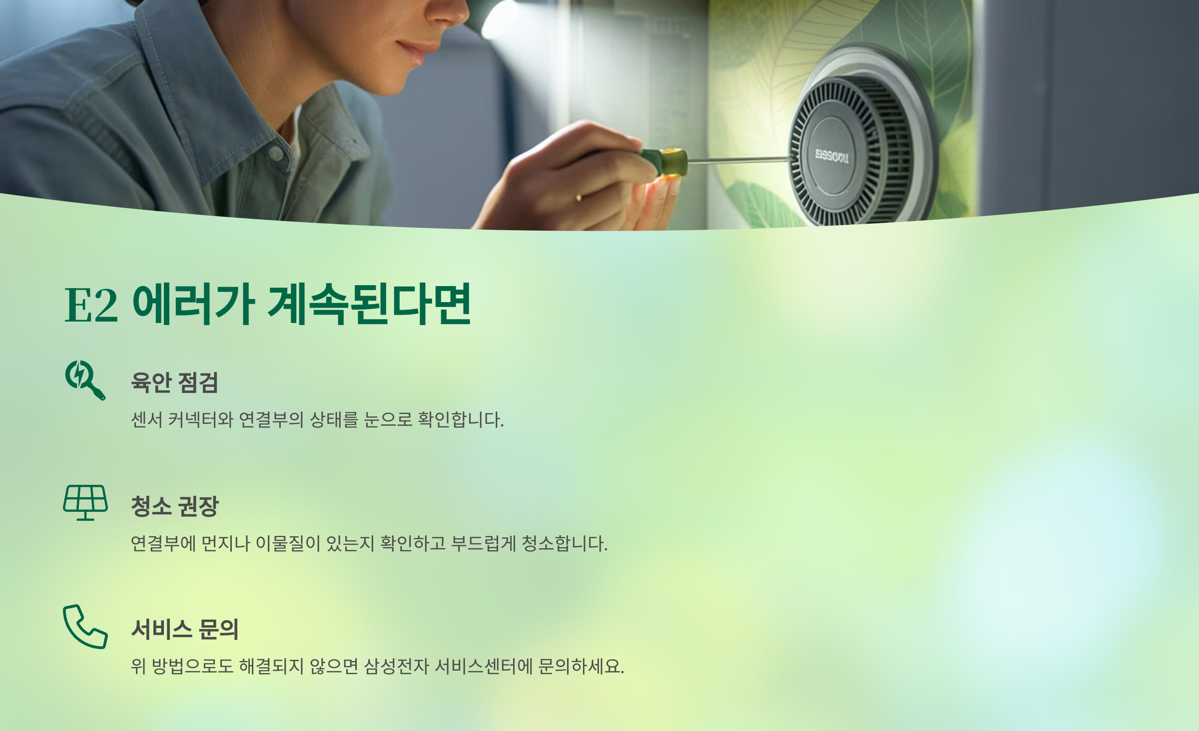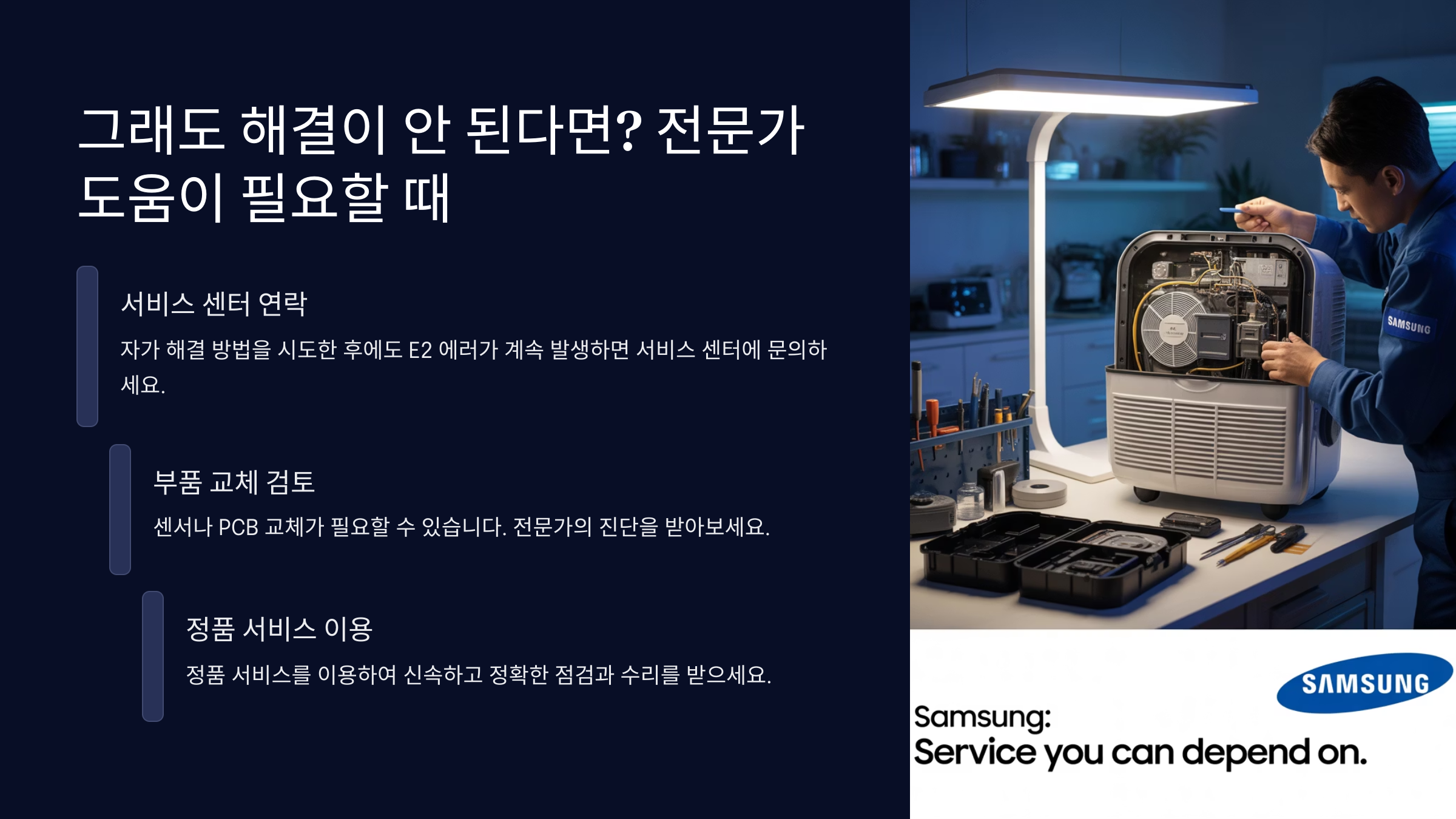 위의 두 가지 방법을 모두 시도했는데도 E2 에러가 사라지지 않는다면, 안타깝지만 센서 부품 자체의 고장이거나 메인보드 문제일 가능성이 높아요. 이 경우에는 개인이 직접 수리하기는 어렵기 때문에 전문가의 도움이 필요합니다.