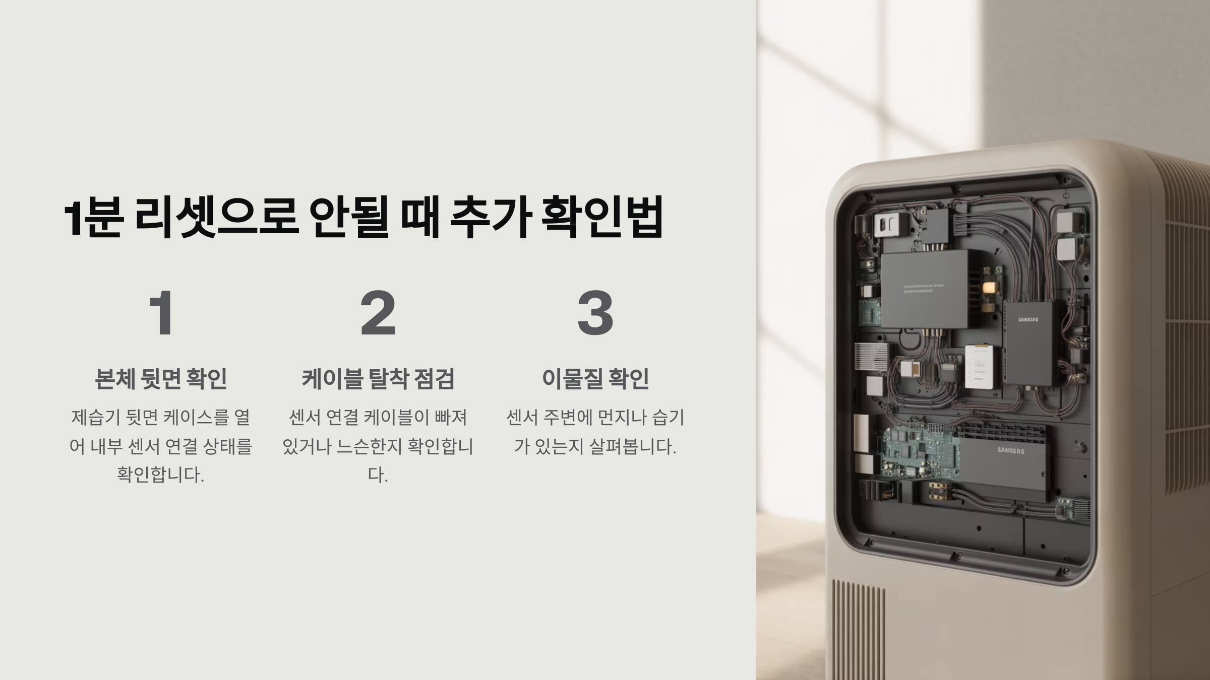 이 센서는 현재 공기 상태를 파악해서 제습기를 얼마나 강력하게, 또는 약하게 돌릴지 결정하는 아주 중요한 부품이에요. 그러니 센서에 문제가 생기면 제습기가 제대로 작동하기 어려운 게 당연하겠죠?