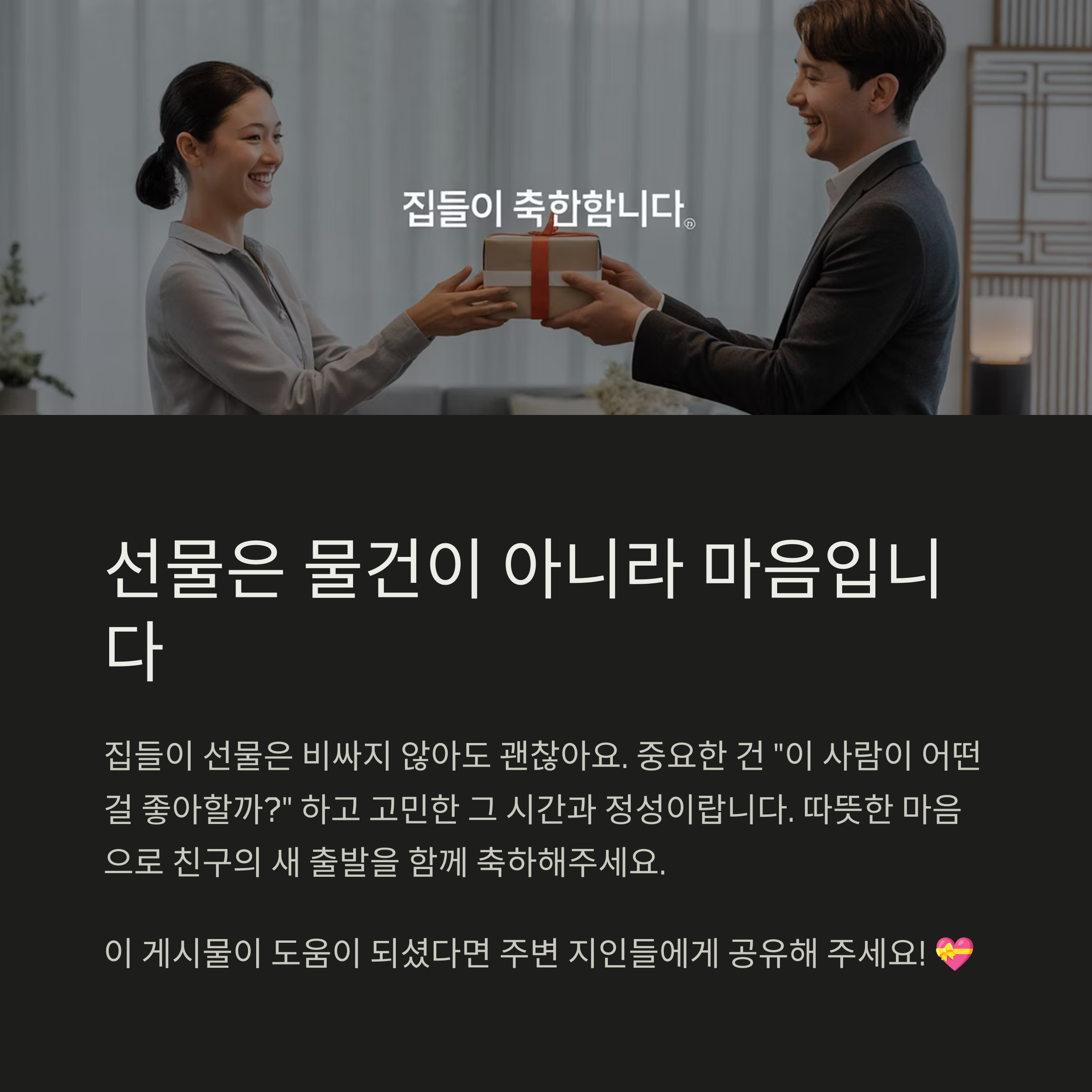 집들이 선물은 꼭 비싸지 않아도 괜찮습니다. 중요한 건 선물을 준비하면서 “이 사람이 어떤 걸 좋아할까?” 하고 고민한 그 시간과 마음이에요.